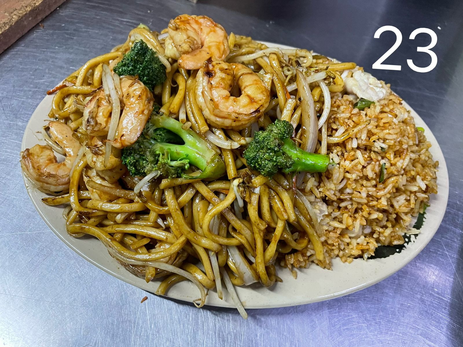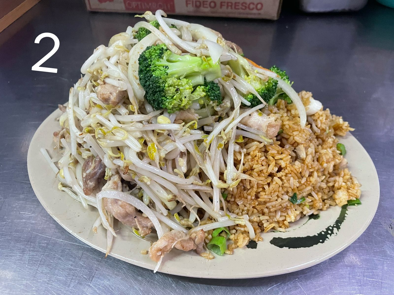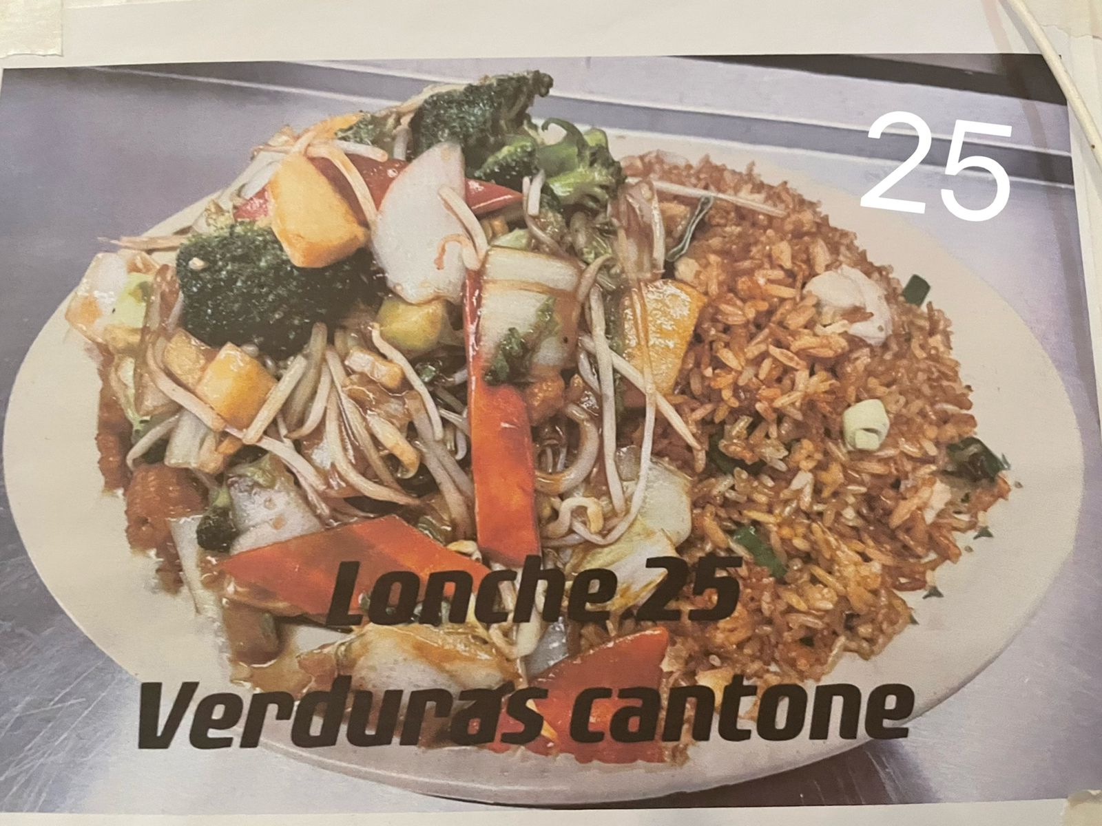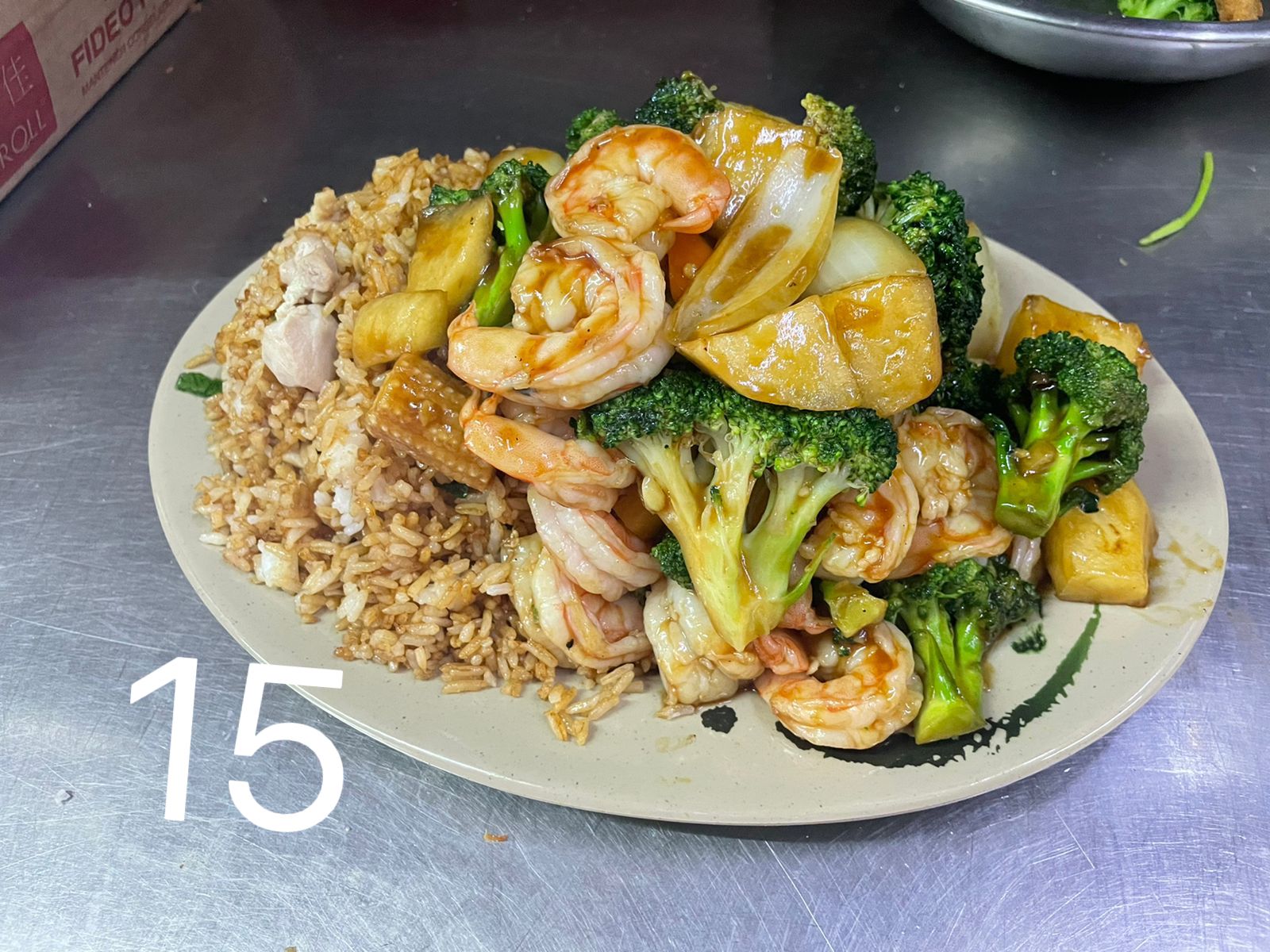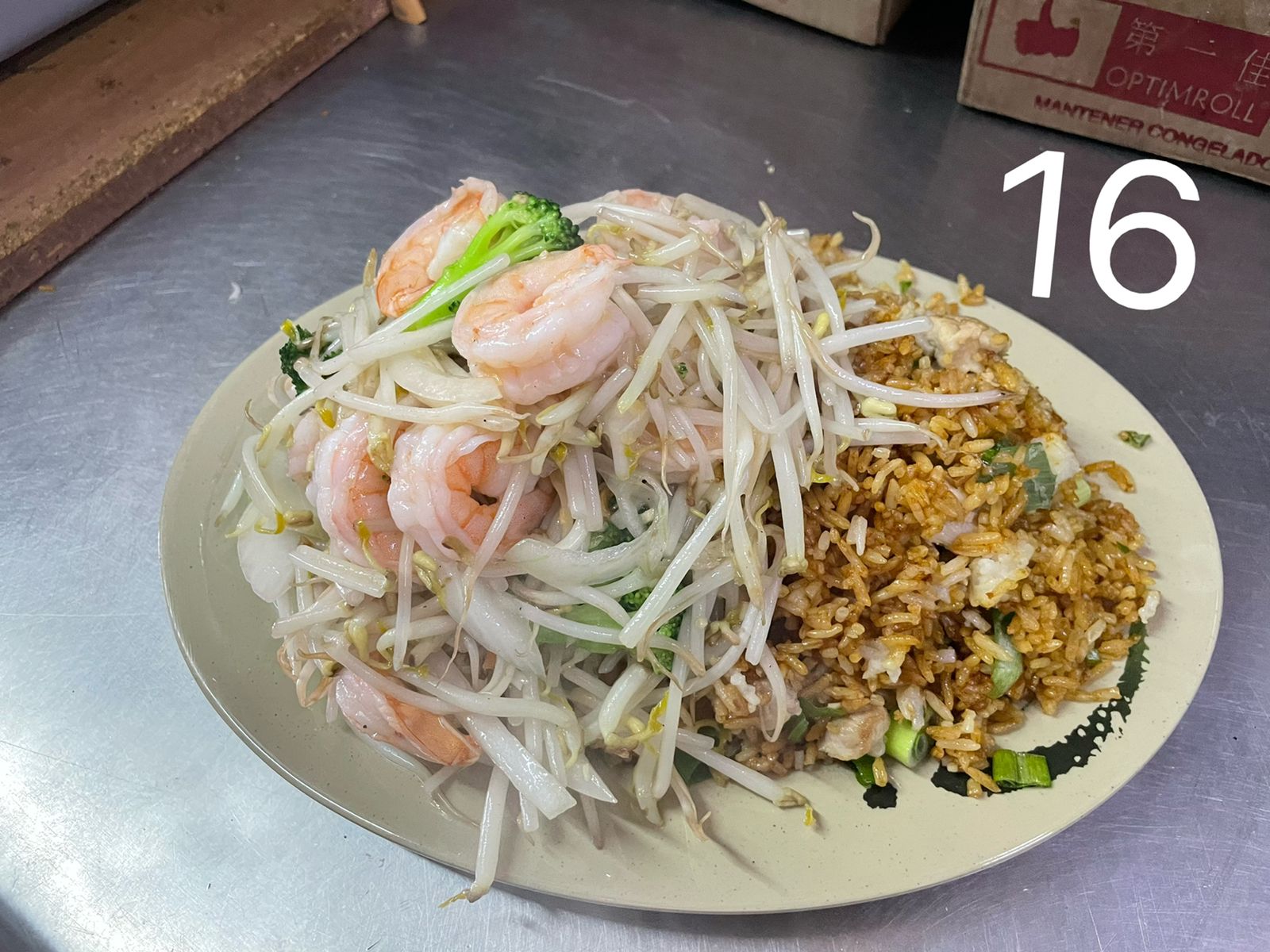 Chop suey camarón (9 pzas) y arroz con pollo.
