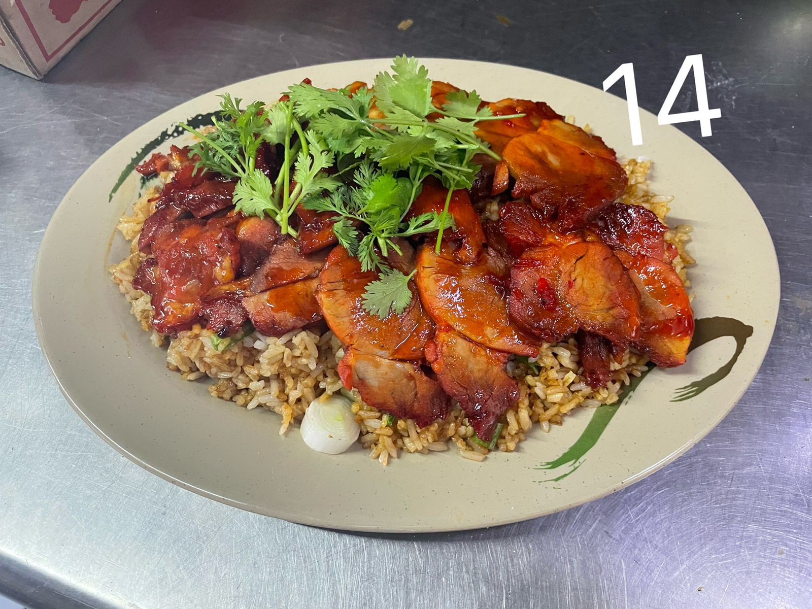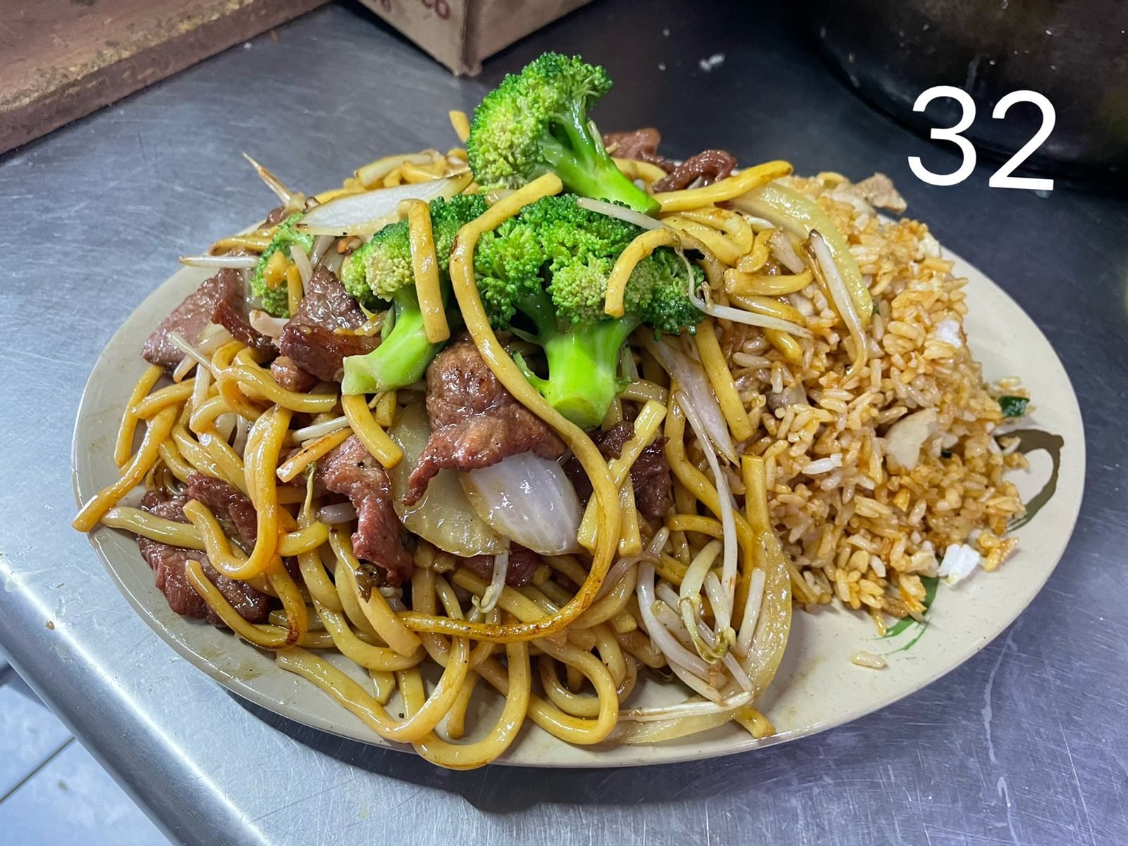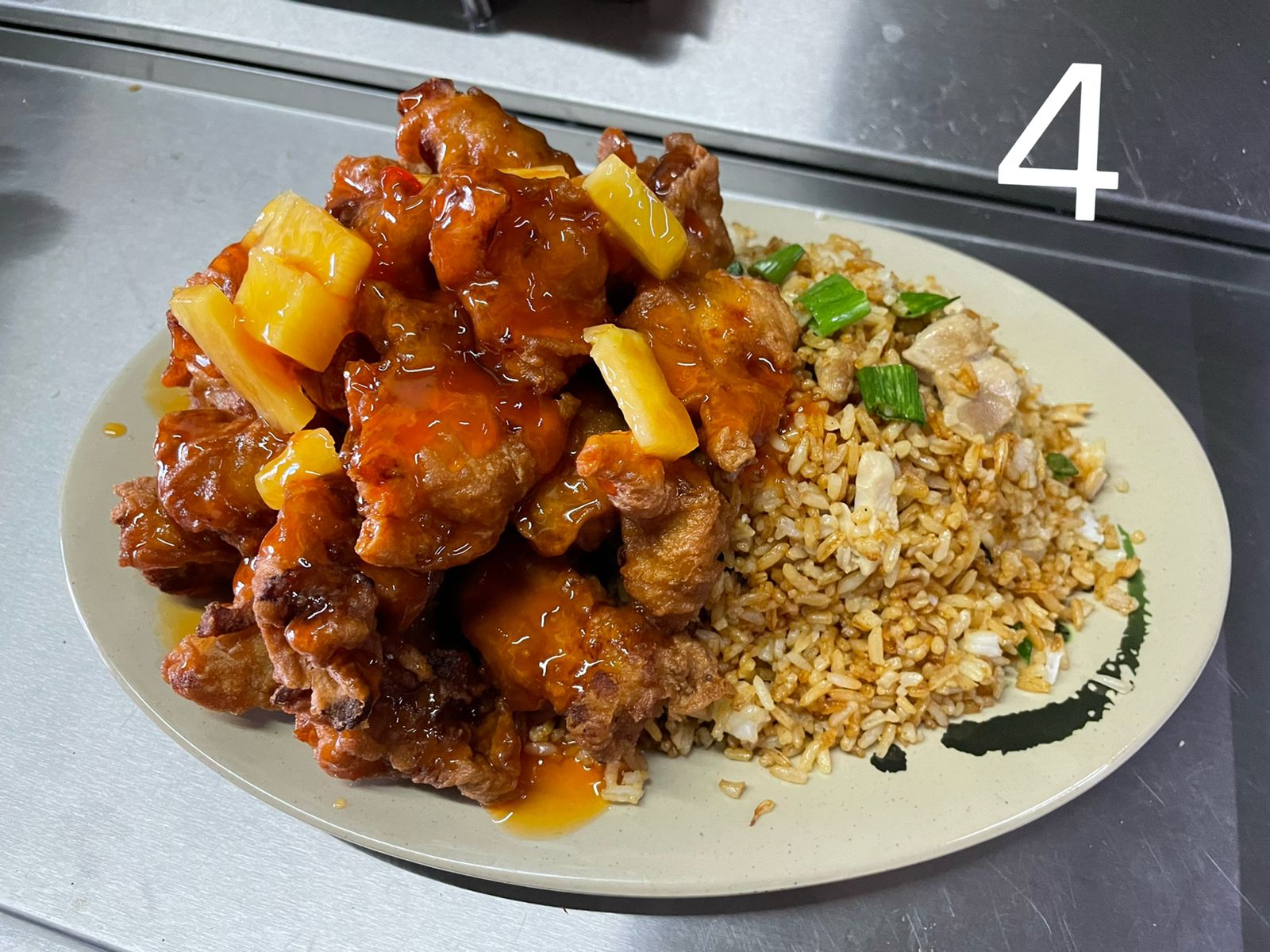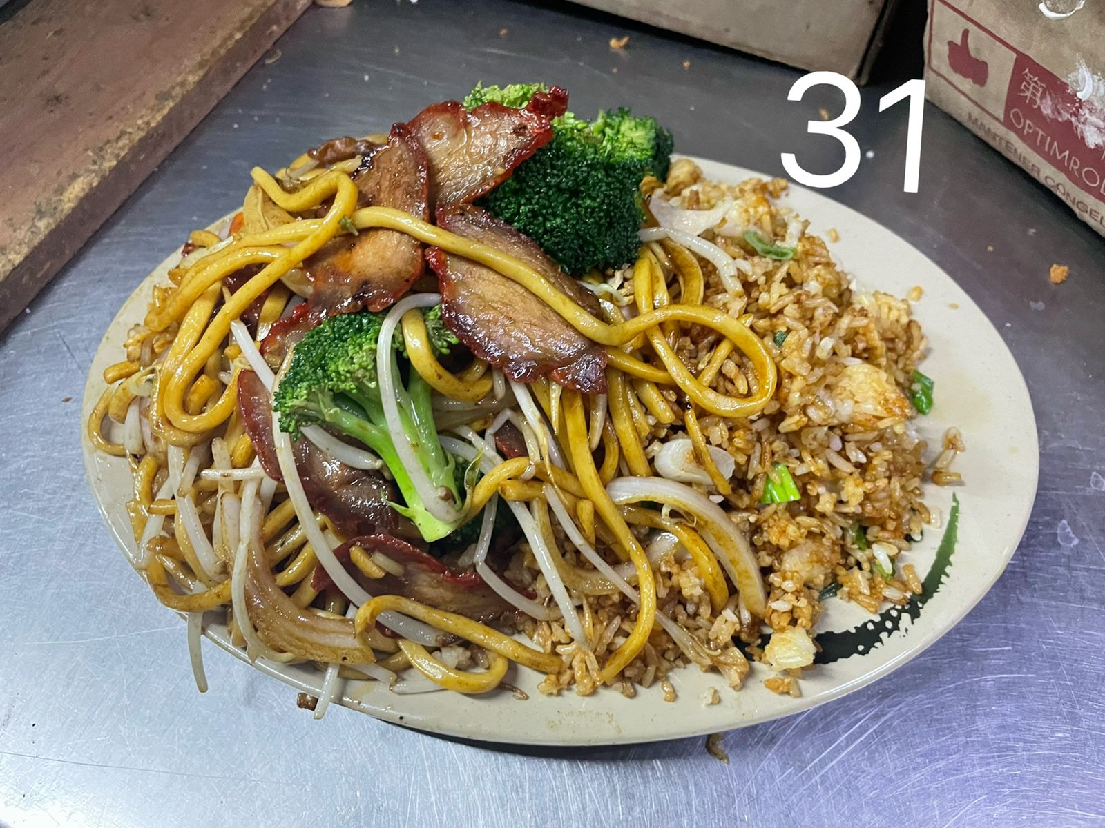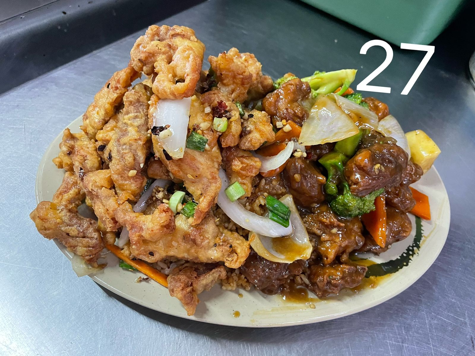 Chop suey camarón (9 pzas) y arroz con pollo.