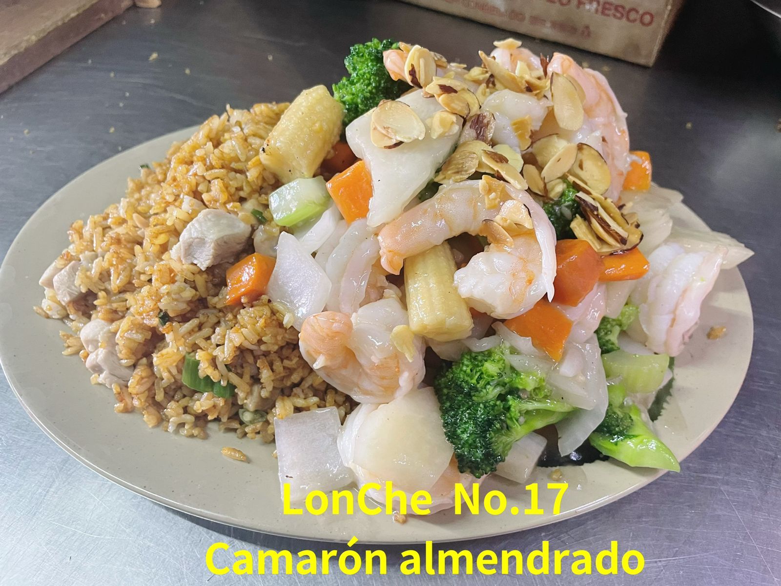 Camarón almendrado (9 pzas) y arroz con pollo.
