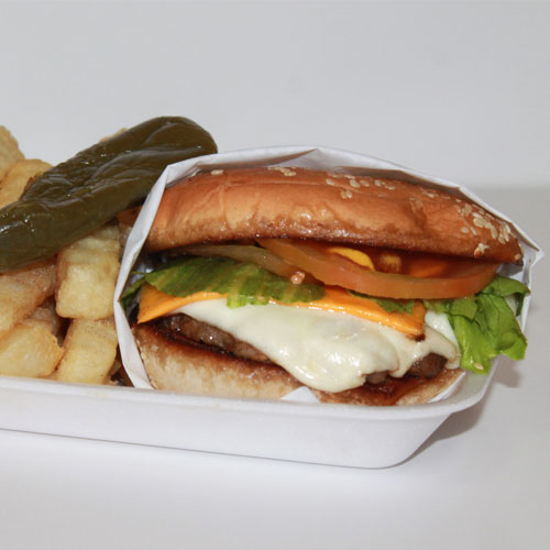 Carne de res, queso monterrey, queso amarillo, lechuga, tomate, cebolla, mostaza, catsup y mayonesa