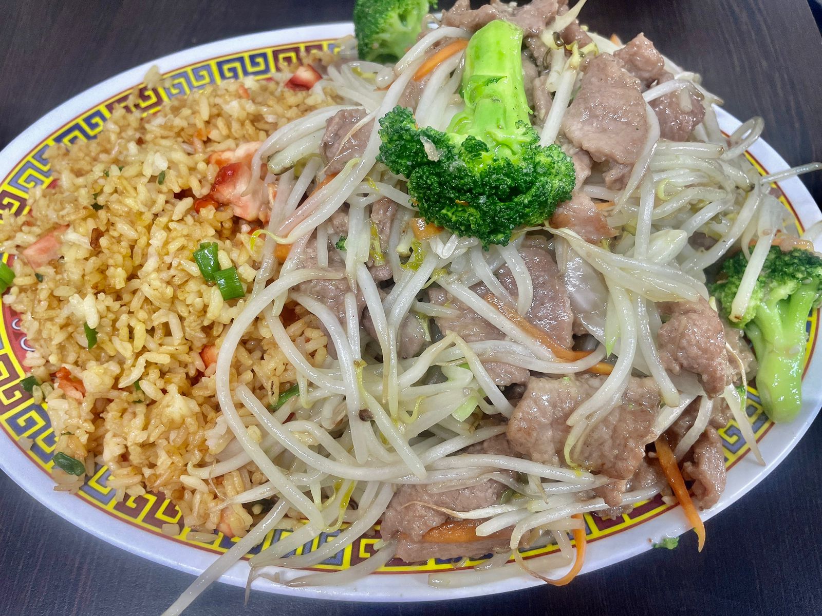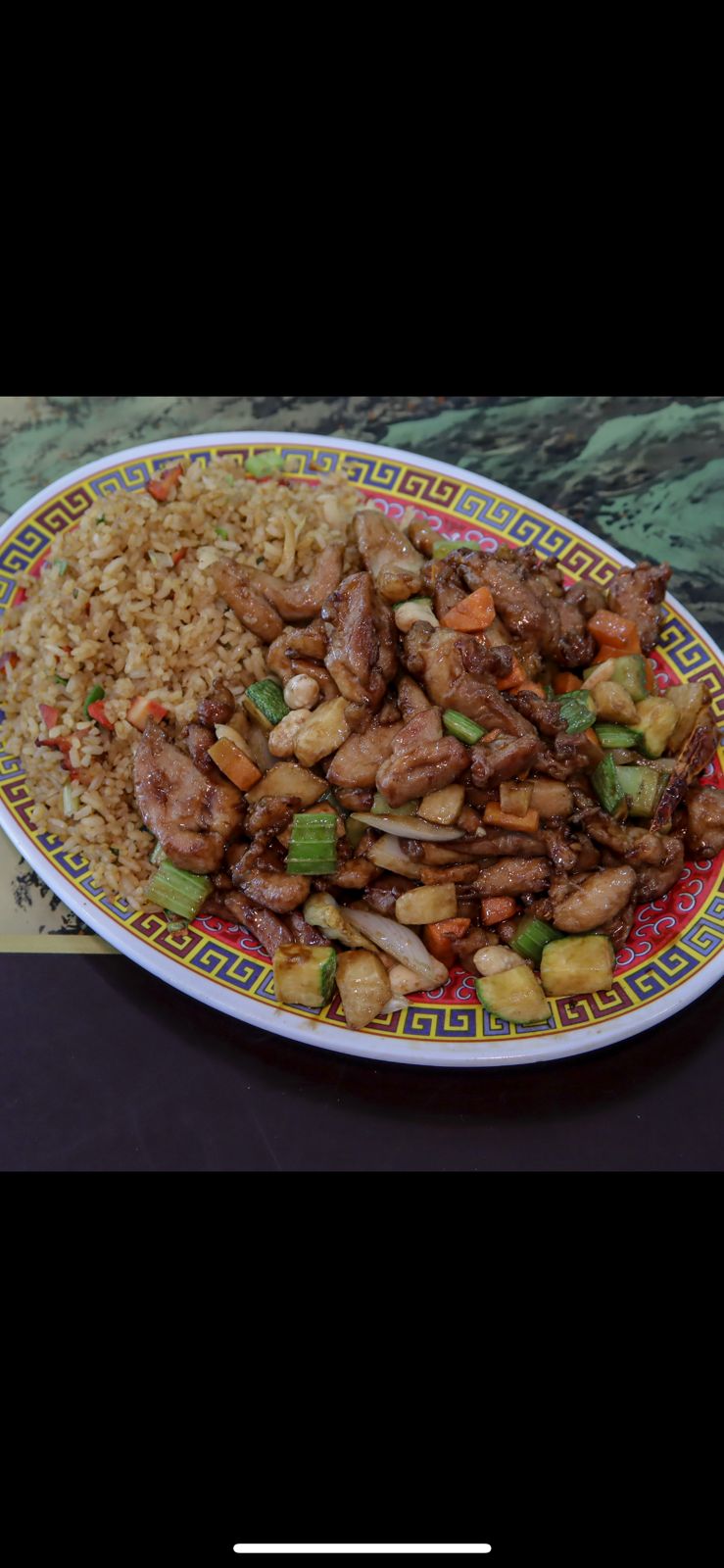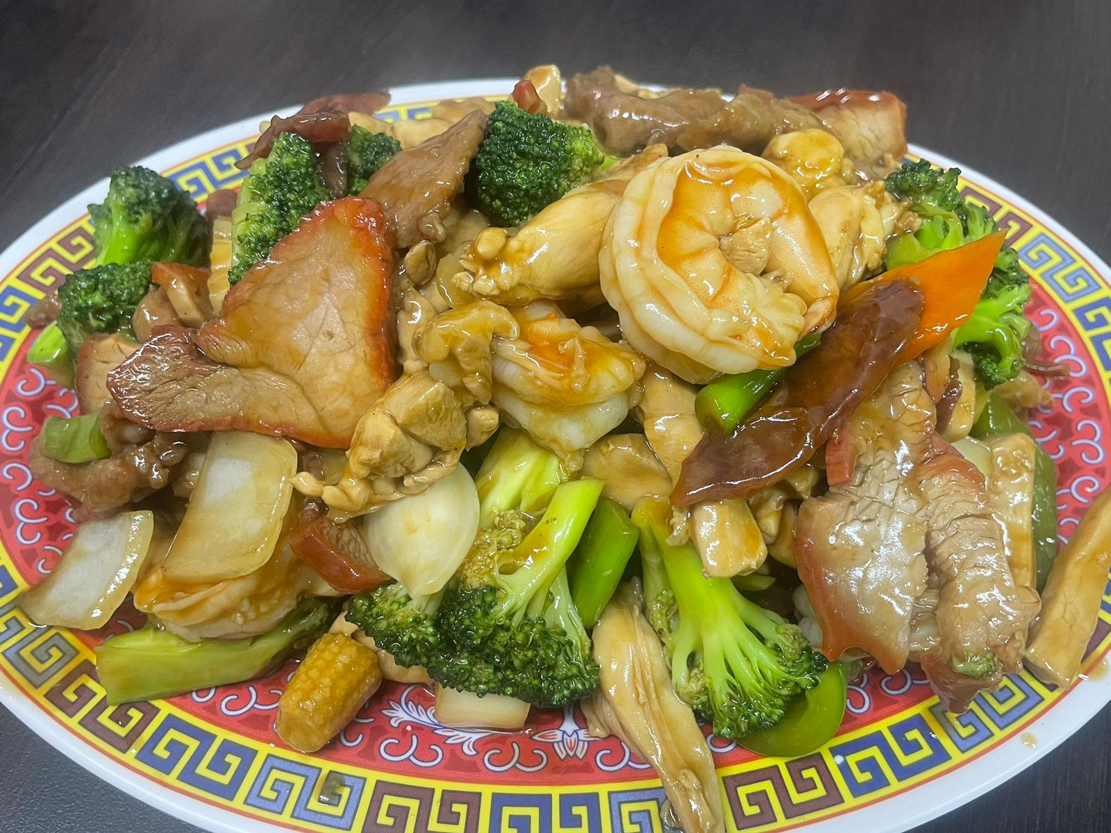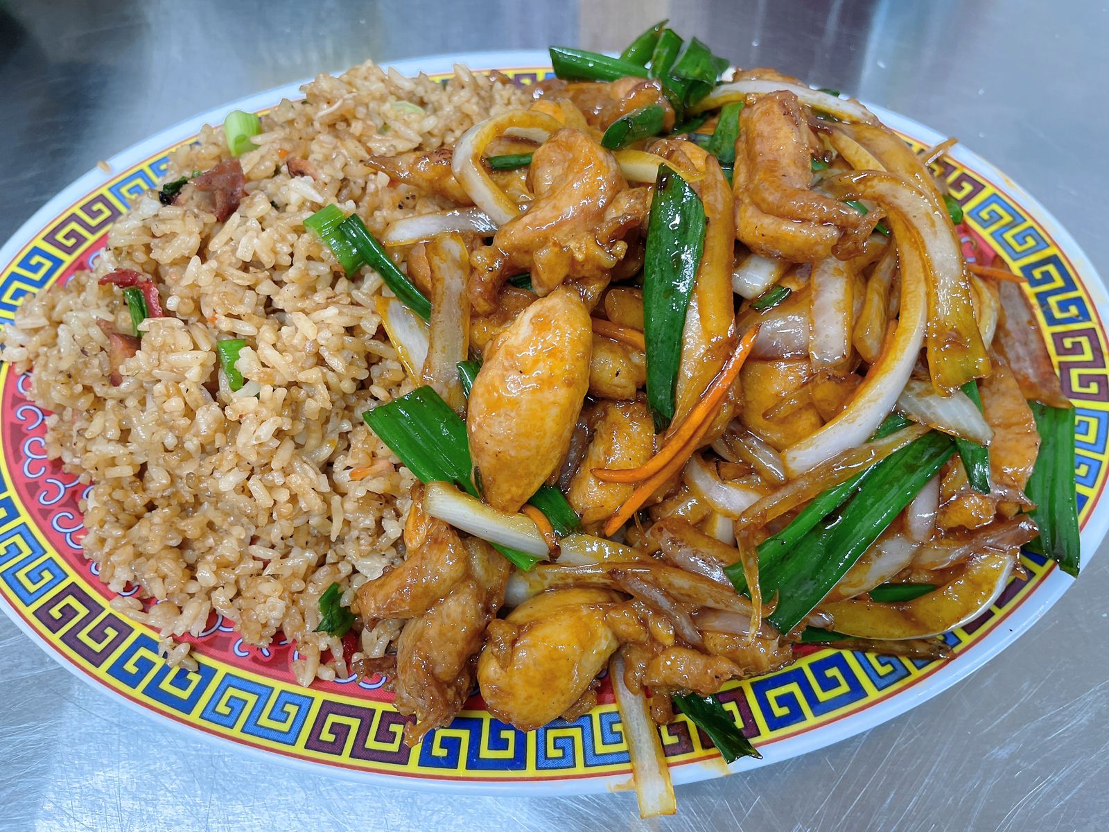 Caldo mandarín, carnita de puerco asada, pollo cantonés, res mongolia, pollo con piña, arroz con camarón.