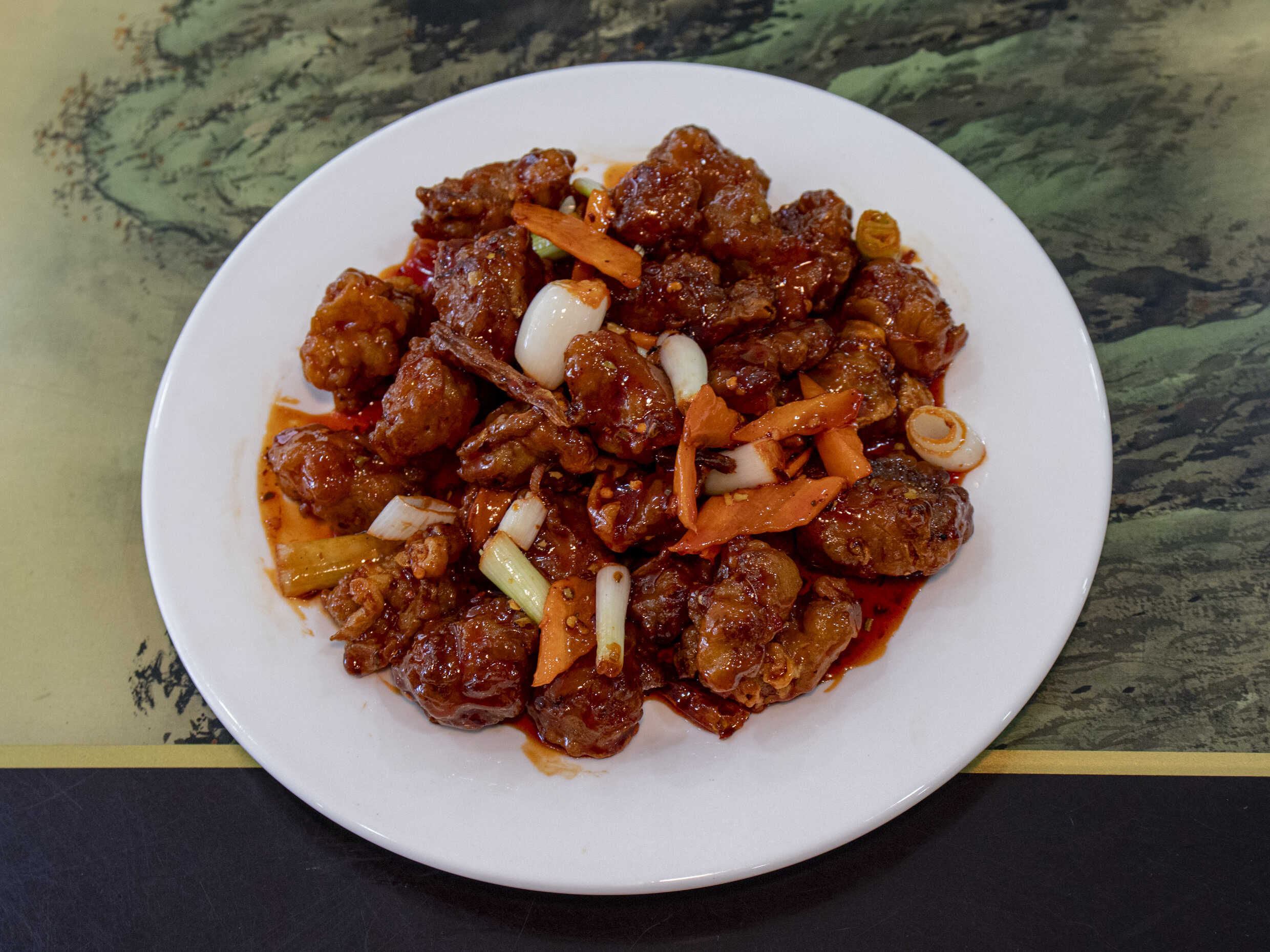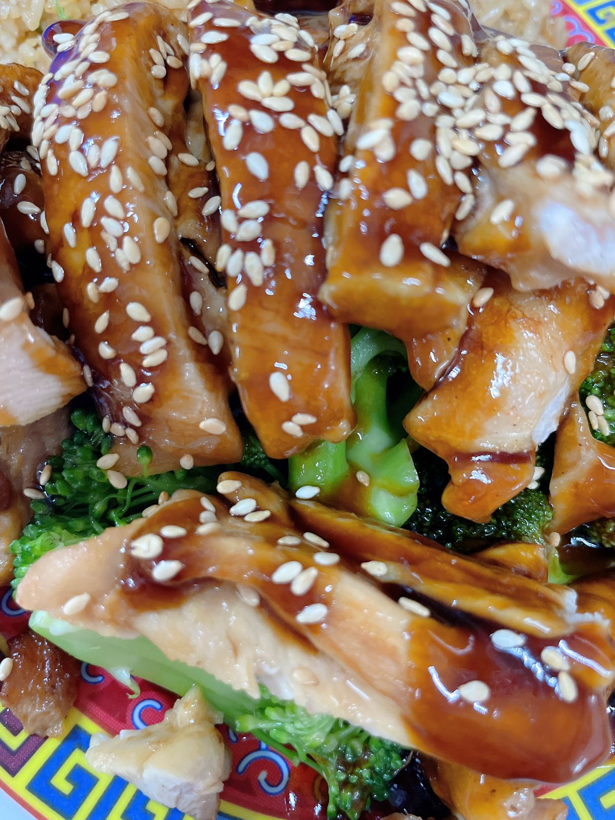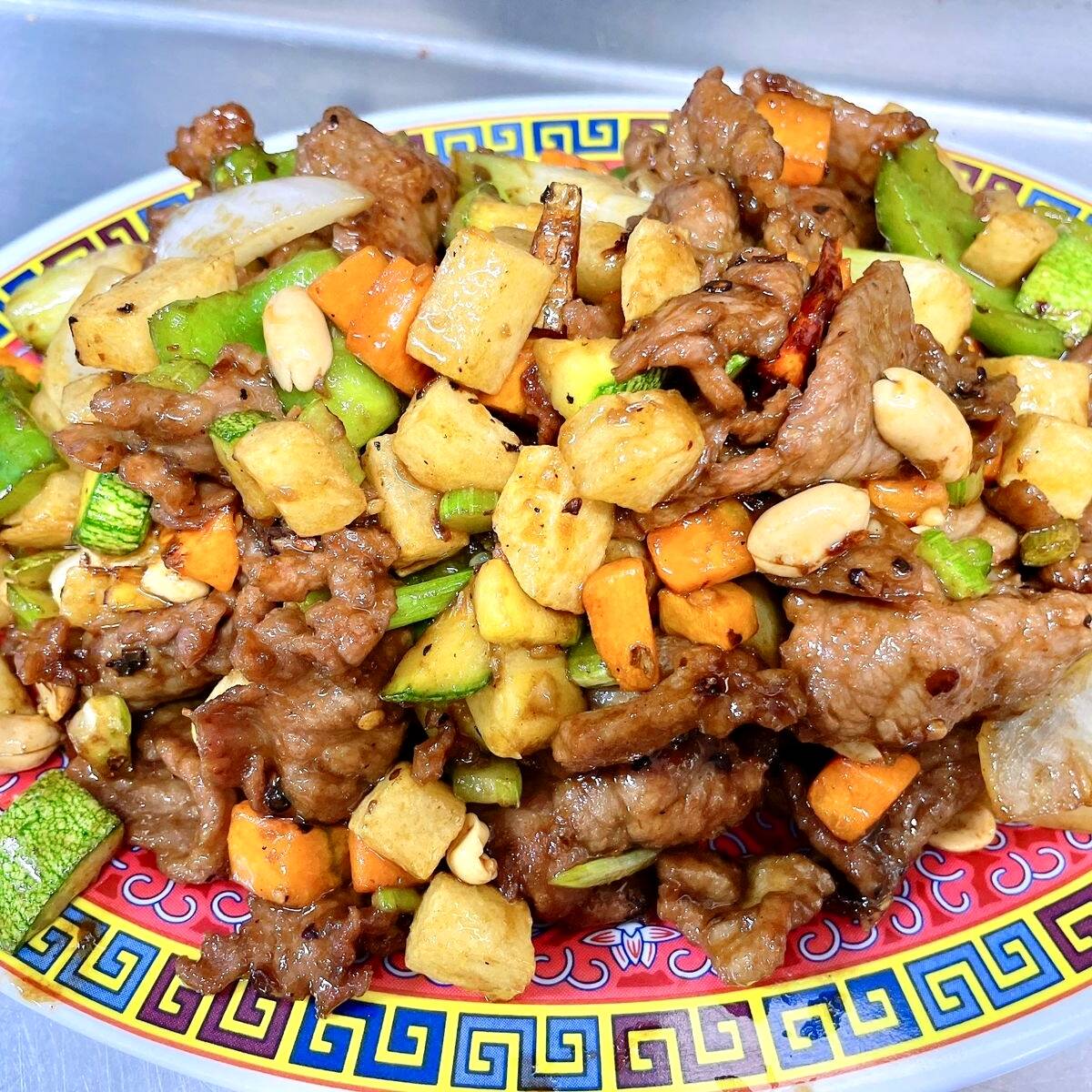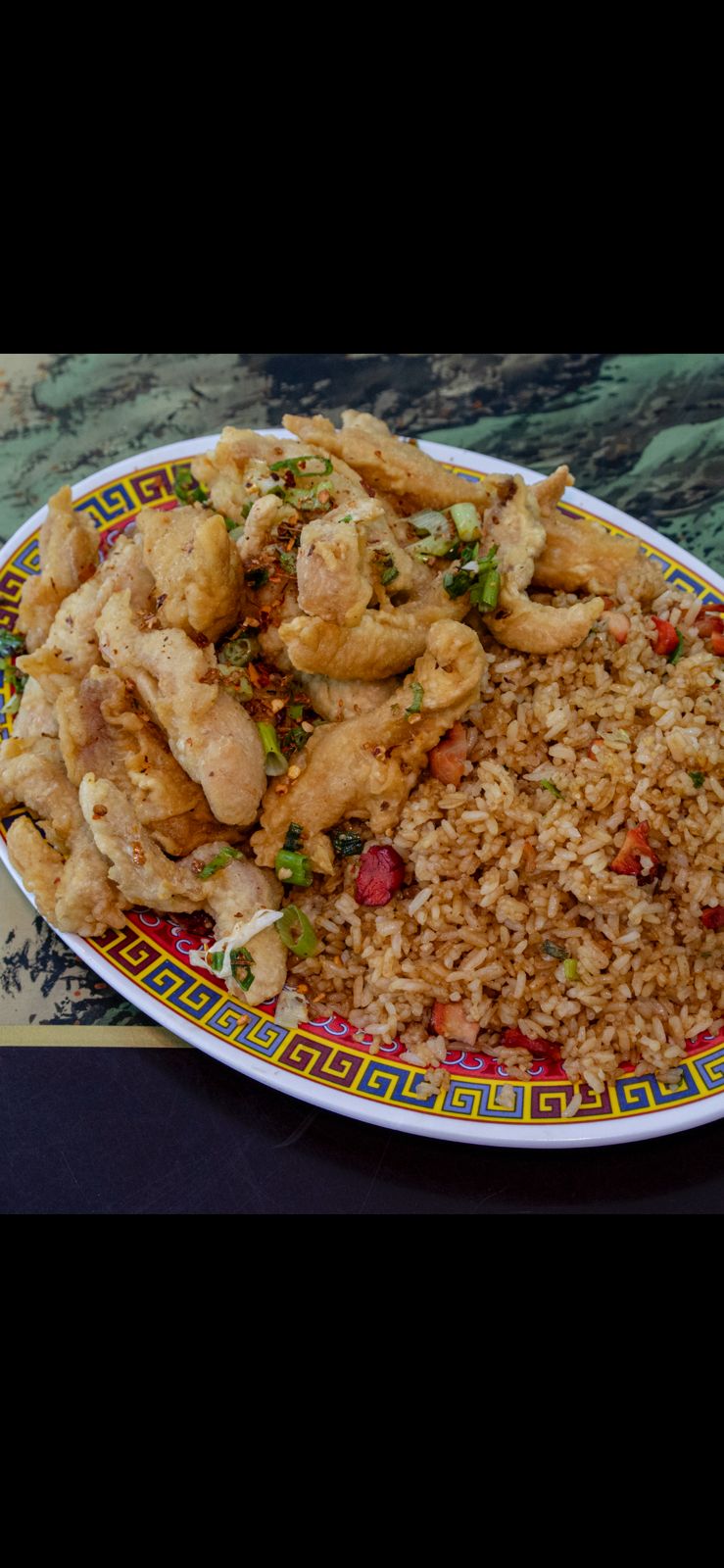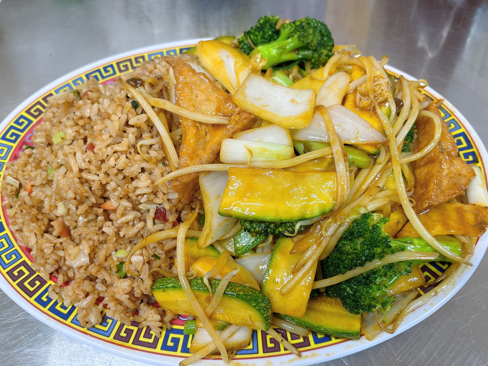 Caldo mandarín, carnita de puerco asada, pollo cantonés, res mongolia, pollo con piña, arroz con camarón.
