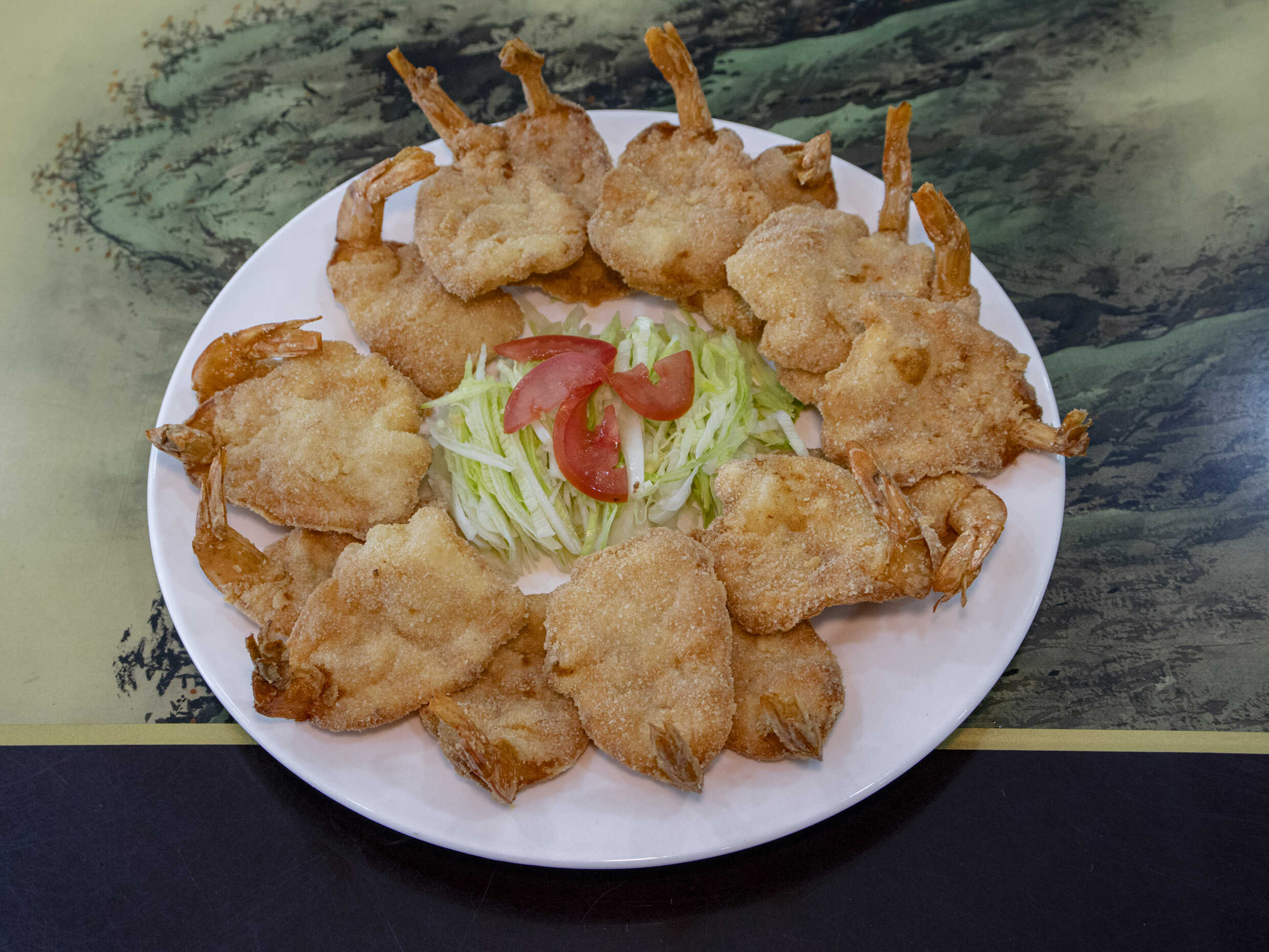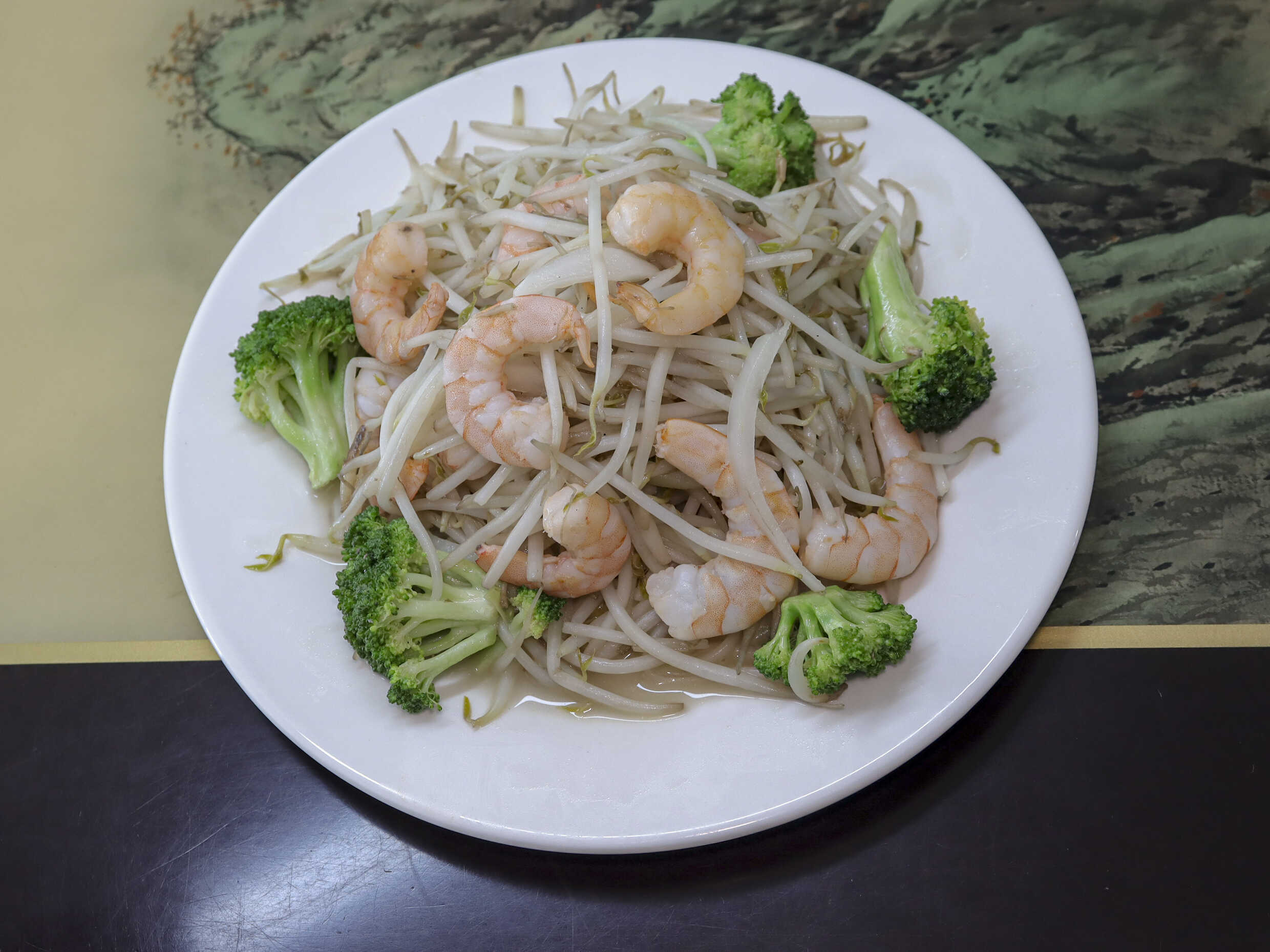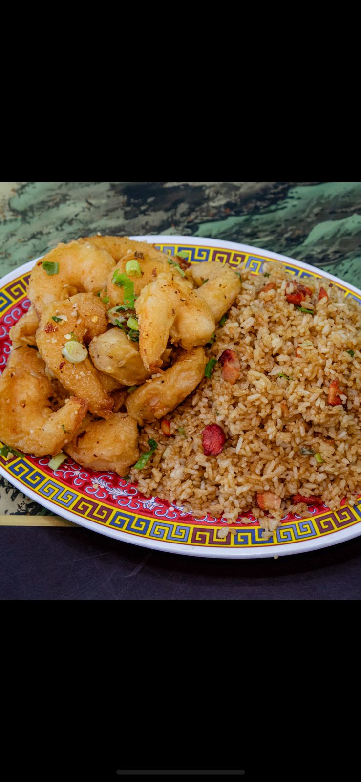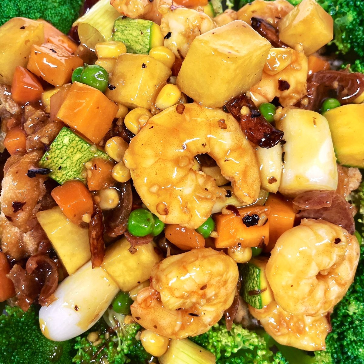 Caldo de abulón/camarón, camarón cantonés, chop suey con camarón, calamar enchilado, camarón a la naranja y arroz con camarón.