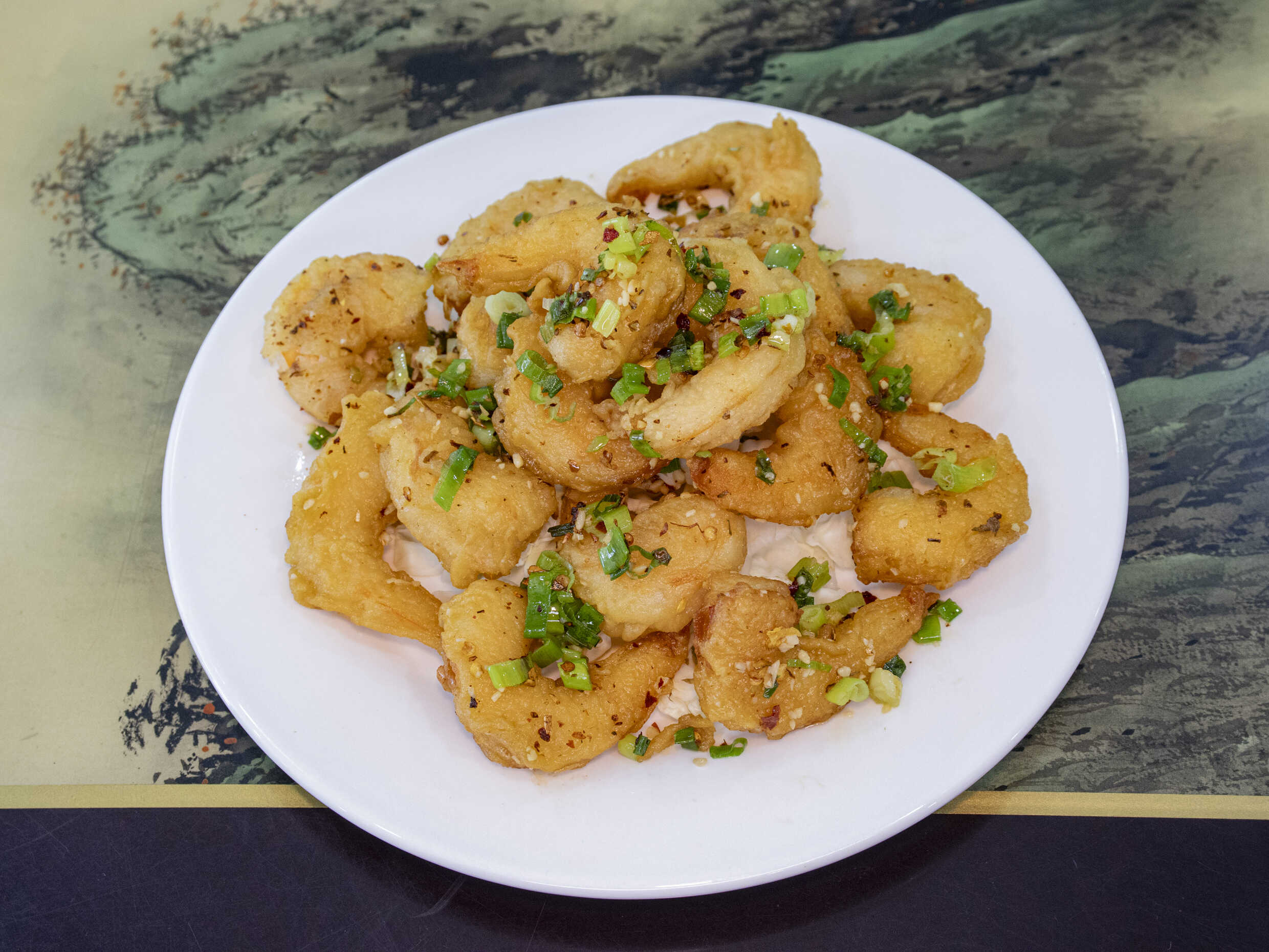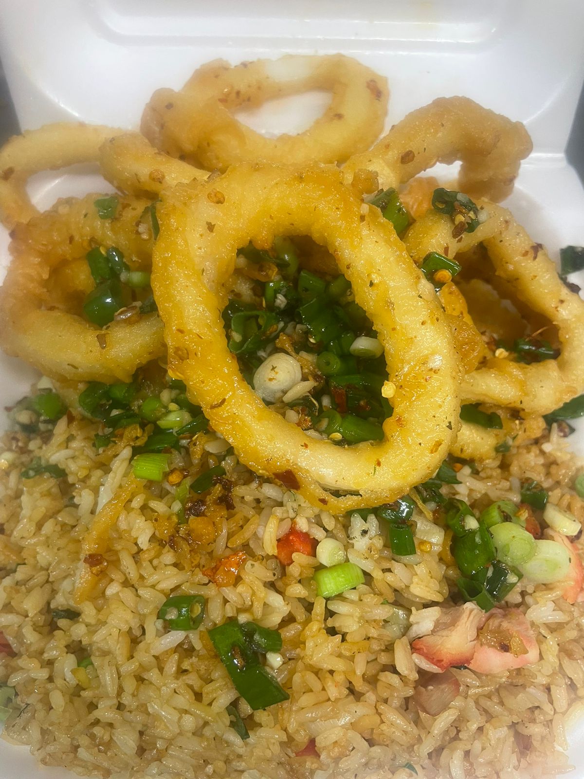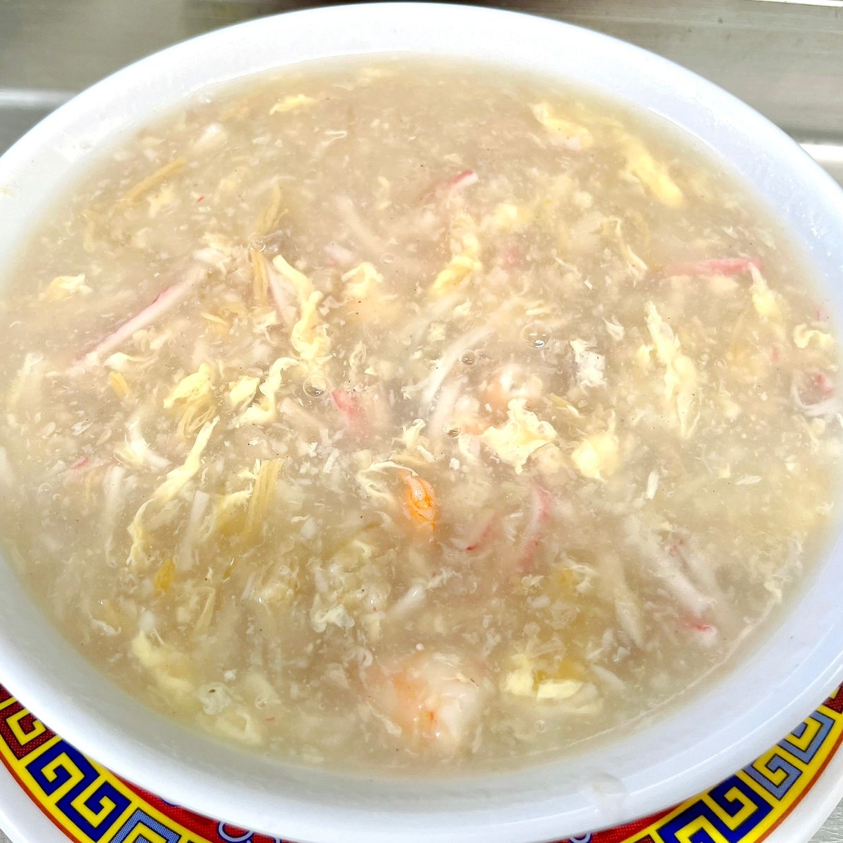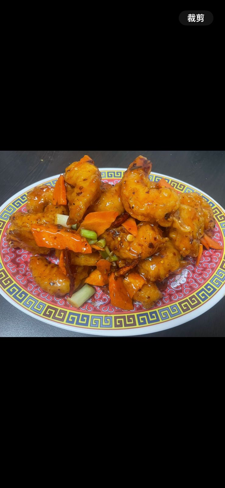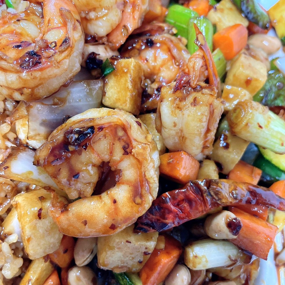 Caldo de abulón/camarón, camarón cantonés, chop suey con camarón, calamar enchilado, camarón a la naranja y arroz con camarón.