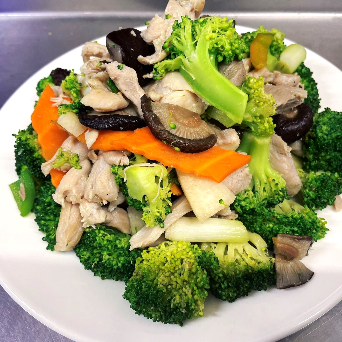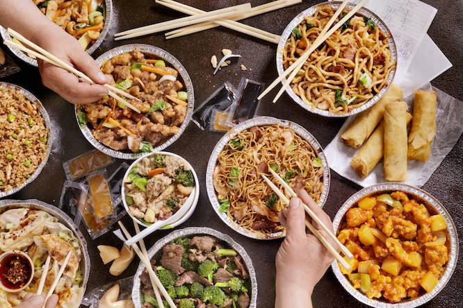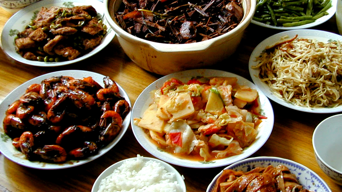 Caldo de aleta de tiburón, carnita de puerco asado, chop suey con camarón, pollo enchilado, res con brócoli, pollo con piña y arroz con camarón.