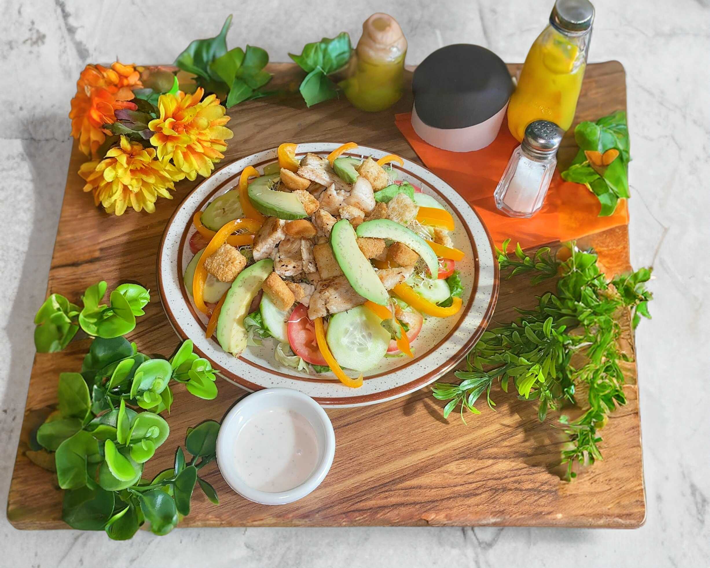 Con ensalada de papa, lechuga orejona, espinaca, pollo, piña, cebolla asada, pepino, tomate, aguacate, queso panela y germinado de alfalfa.