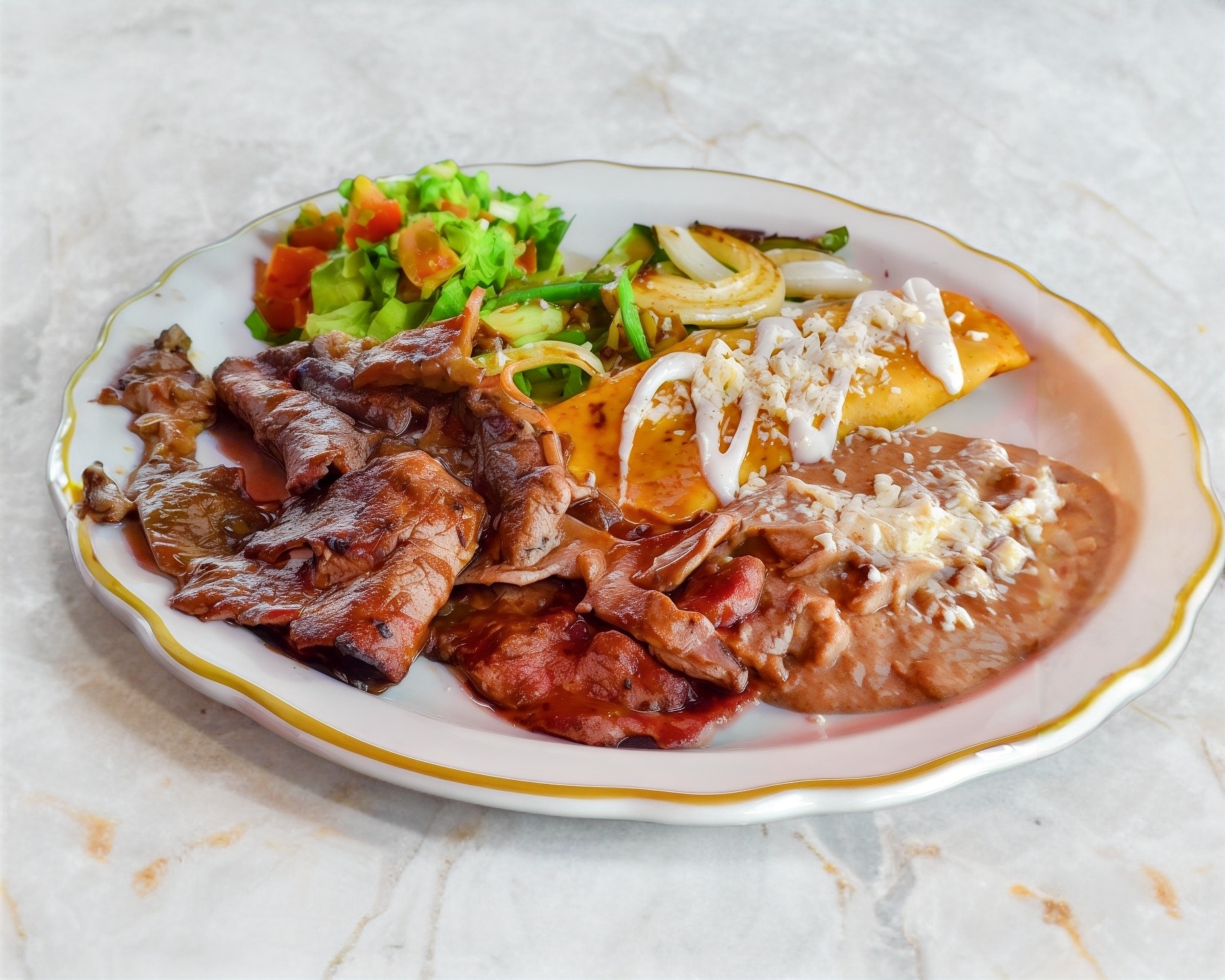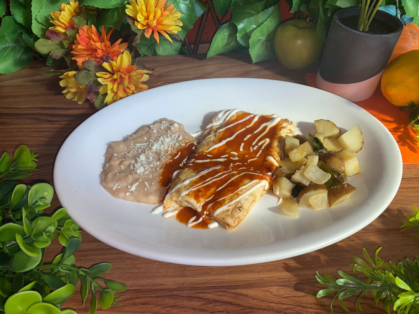 Enchilada, frijol, chile, cebollita y guacamole.