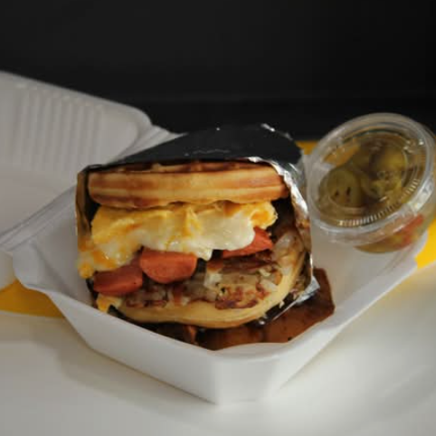 Delicioso sándwich waffles con pollo crujiente, tocino, huevo, queso cheddar y aderezo chipotle.