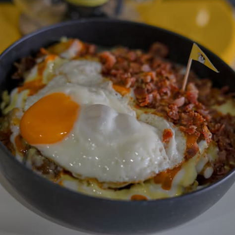 Papa, mezcla de quesos, aderezos de la casa y huevo cocido.