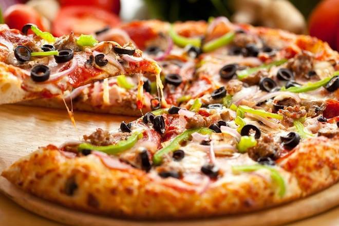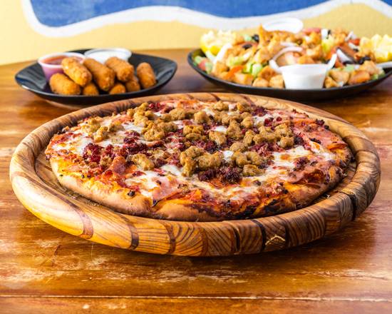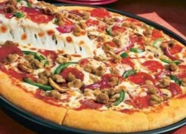 Jamón, pepperoni, aceitunas, morrón, champiñones, cebolla y salchicha italiana.