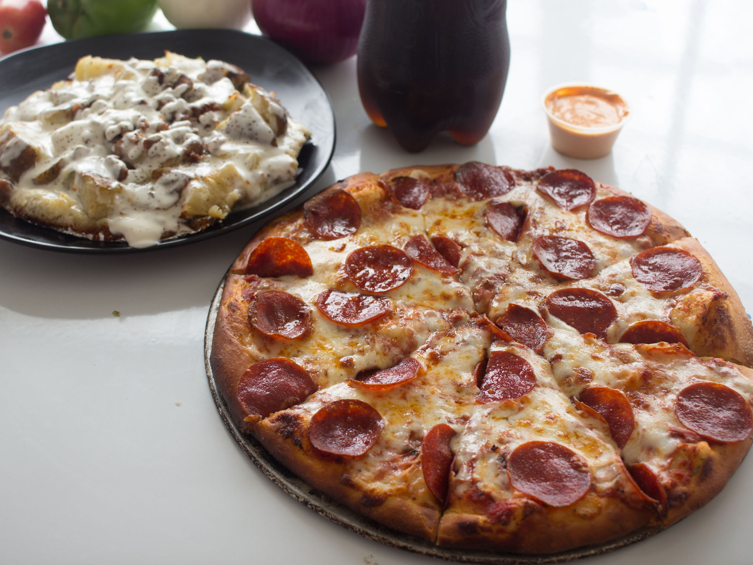 Pizza mediana de pepperoni, papa al horno, soda de 2 litros.