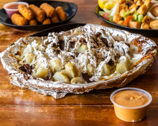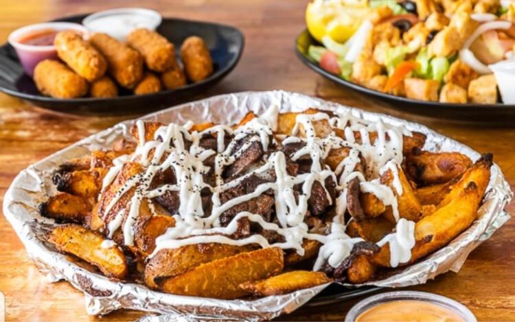 Papas fritas, queso mozzarella, carne asada, crema, sal y pimienta.