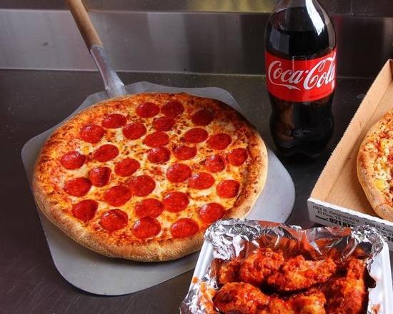 2 Familiares de pepperoni, alitas y soda de 2 litros.