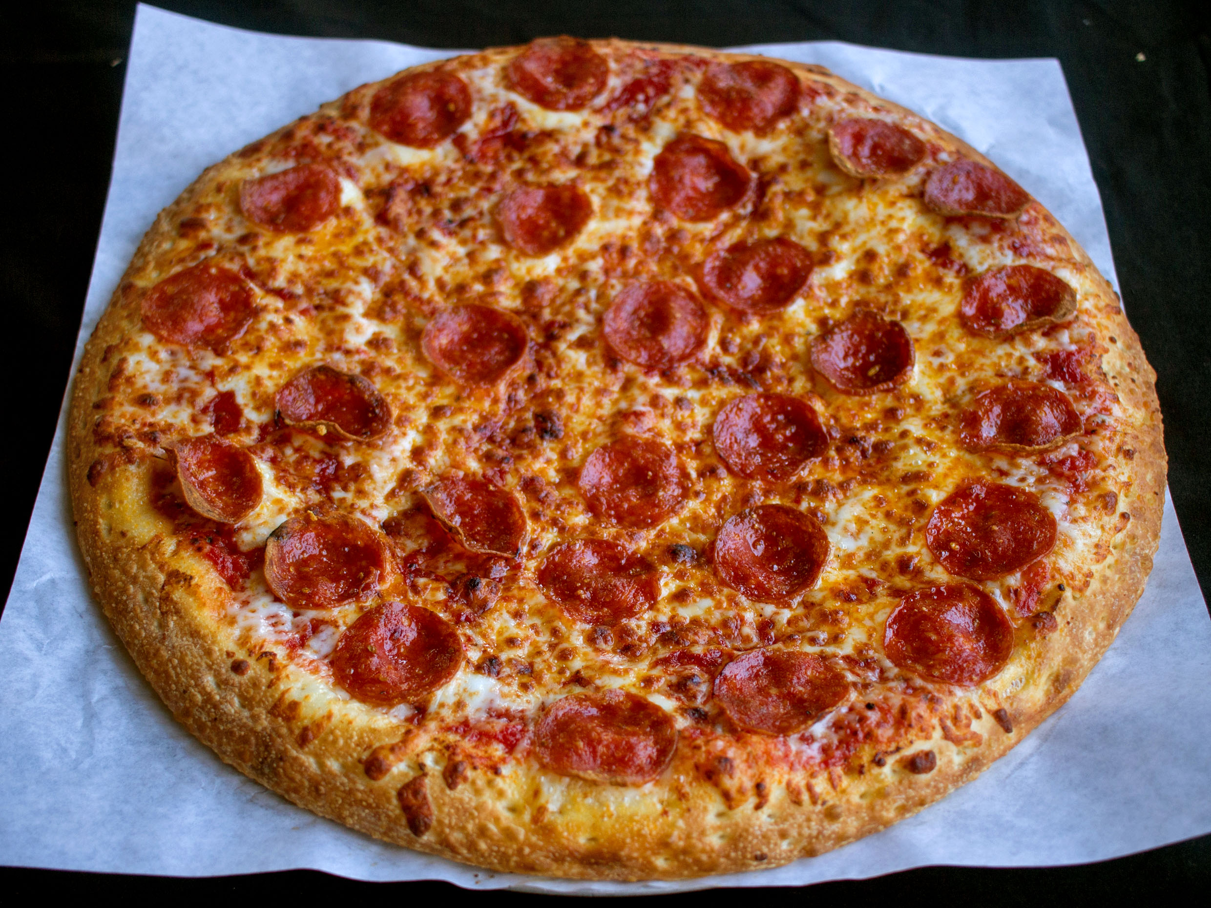 Pizza grande con extra queso, queso parmesano, doble pepperoni y orilla de mantequilla de ajo.