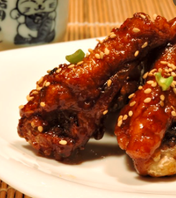 Res bañada con salsa teriyaki acompañado de arroz y ensalada de pepino agridulce