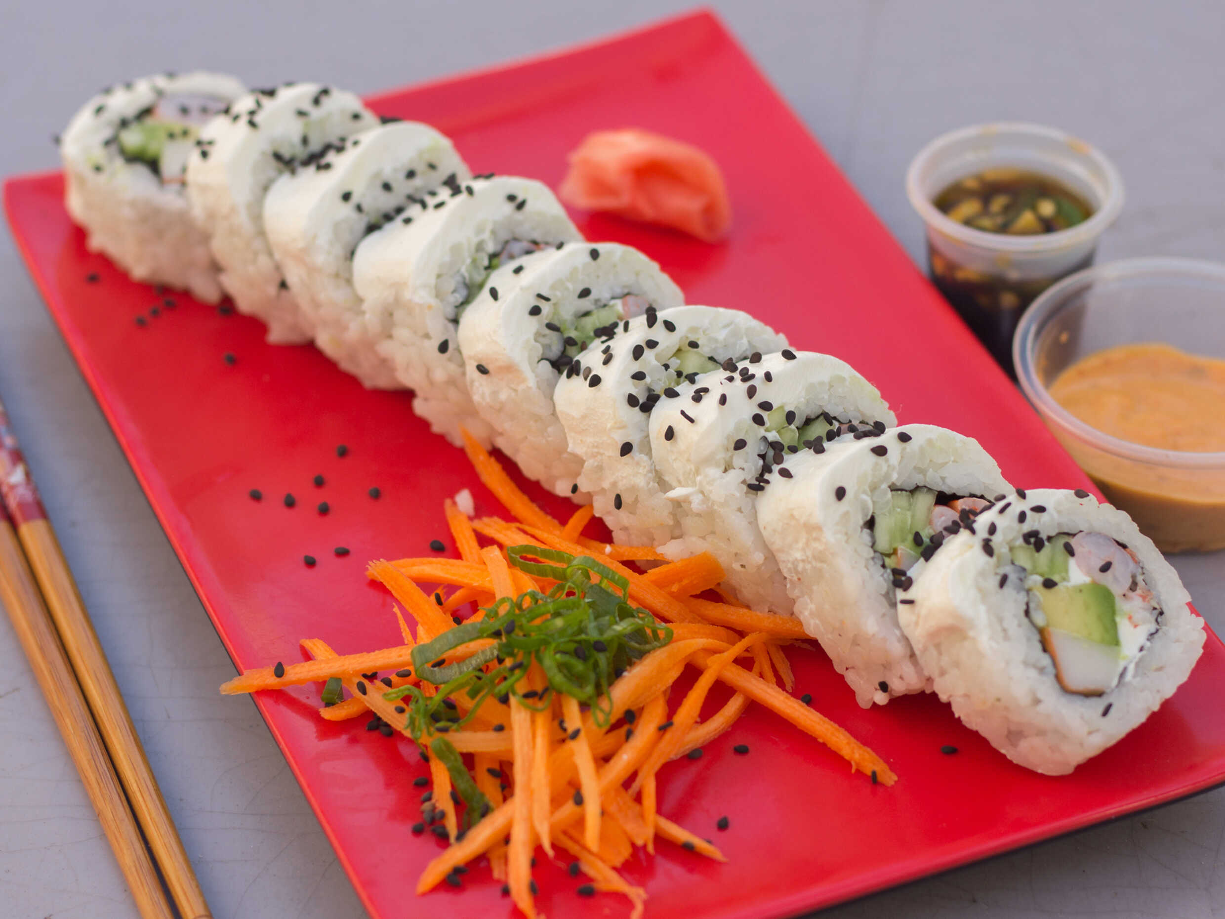 Arroz para sushi acompañado con tampico, aguacate, queso phila, zanahoria y cambray