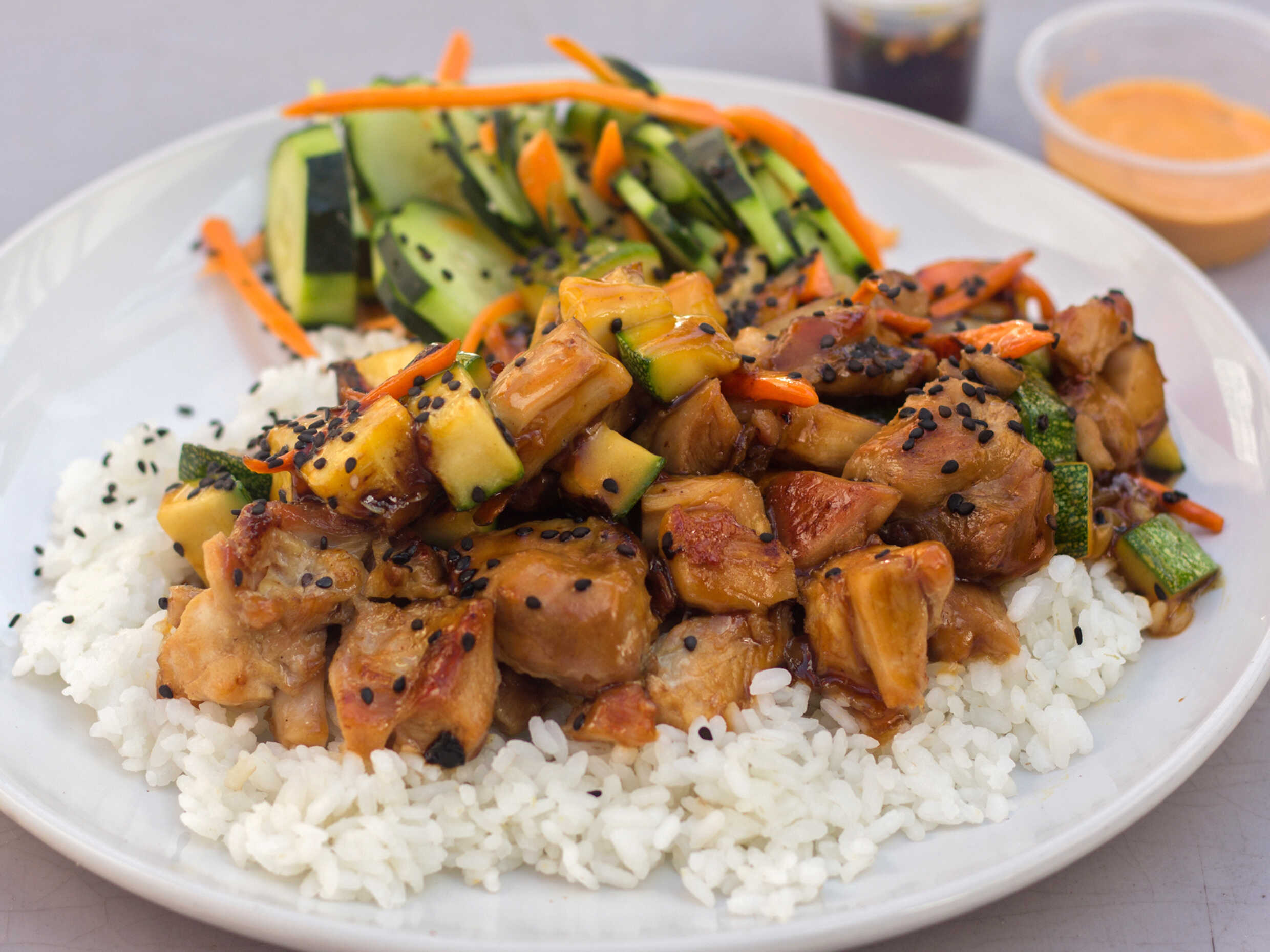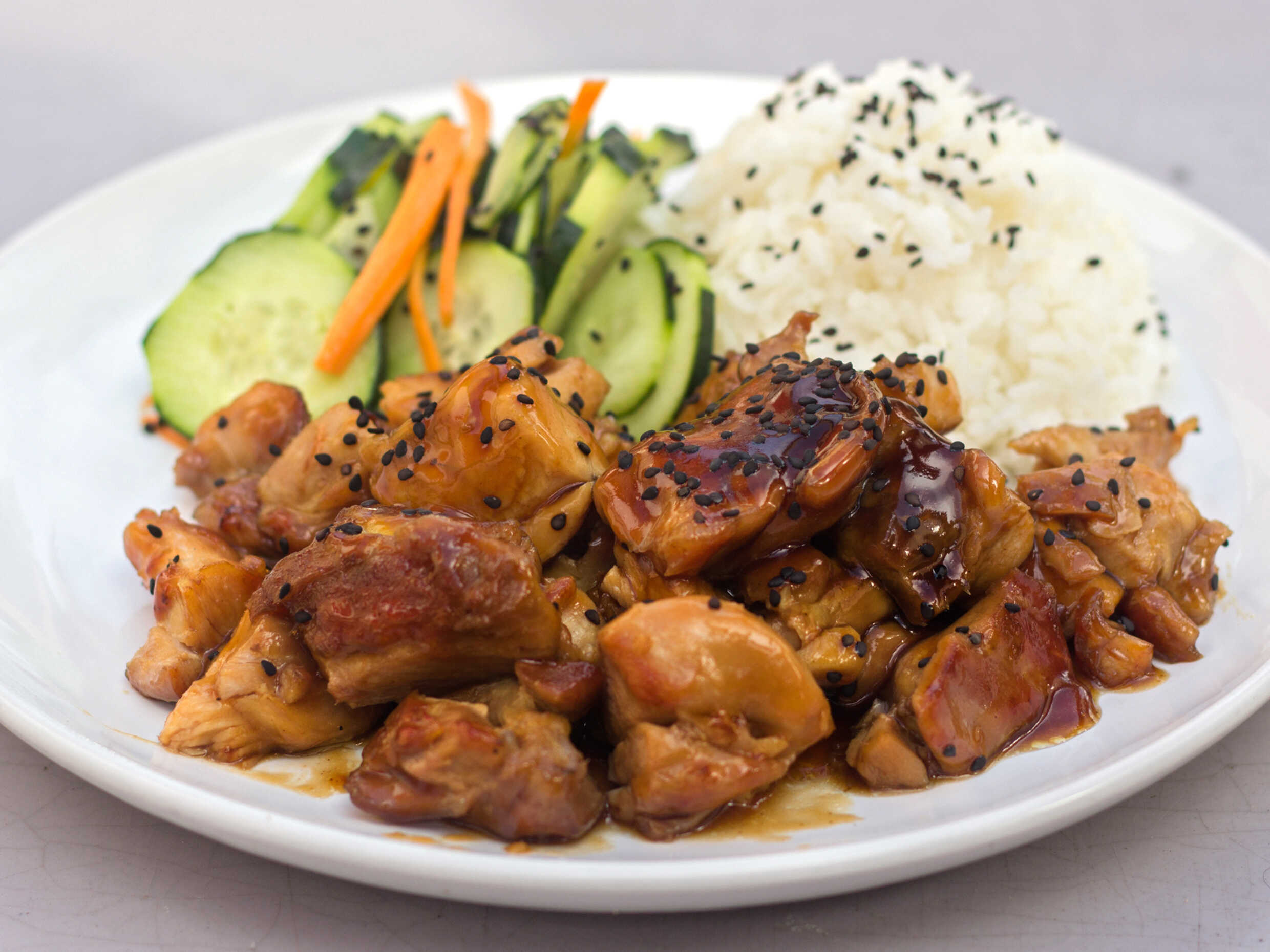 Pollo, calabaza, zanahoria y cebolla asados guisados al momento con salsa teriyaki y montado sobre una cama de arroz acompañado de salsa agridulce