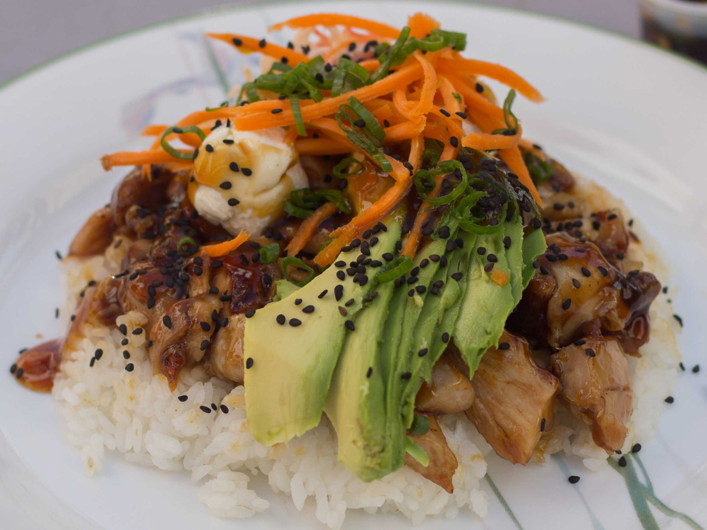 Bowl con pollo en salsa teriyaki acompañado de arroz blanco