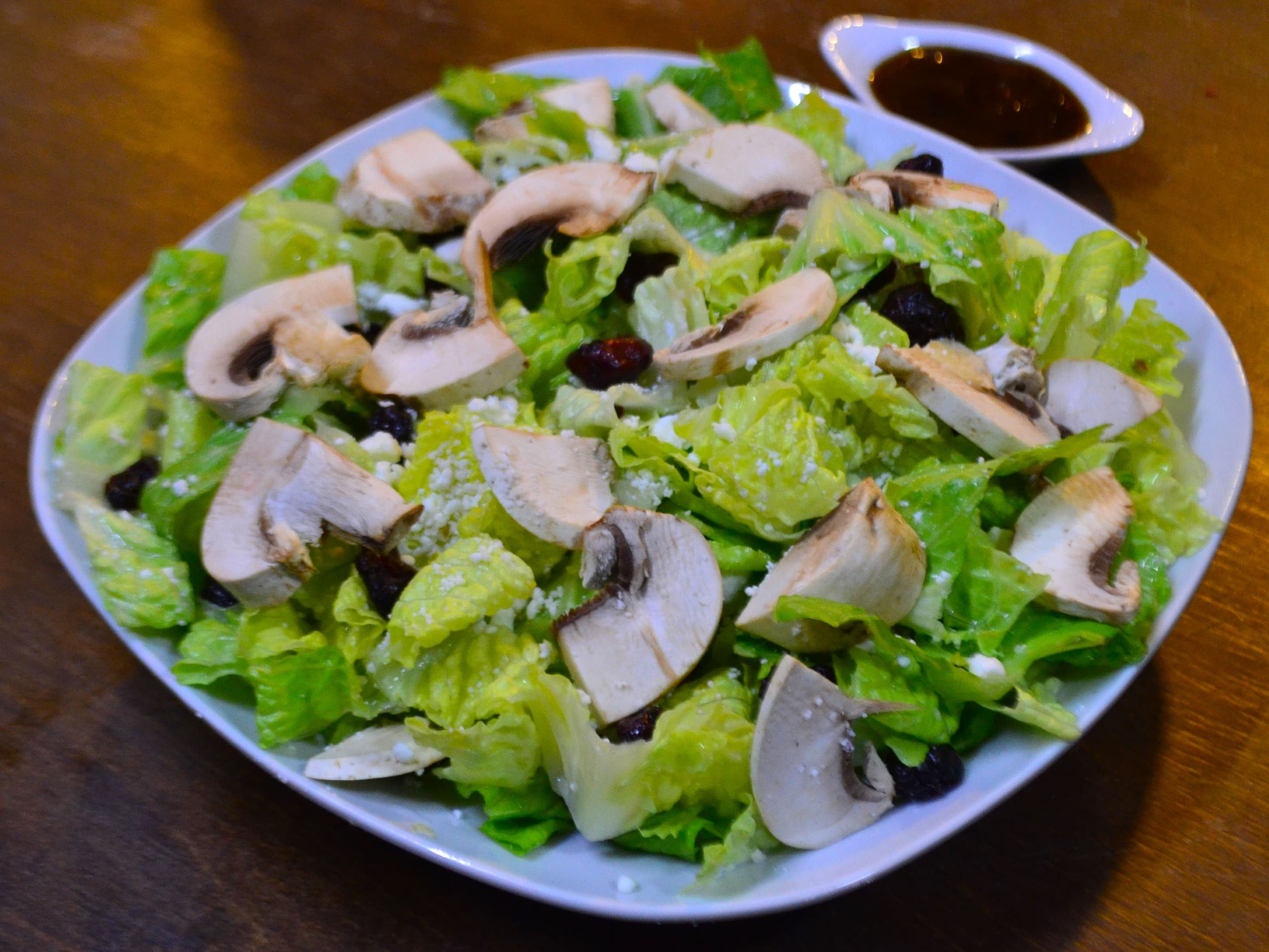 Lechuga romana, champiñones, queso feta, arándanos y aderezo vinagreta.