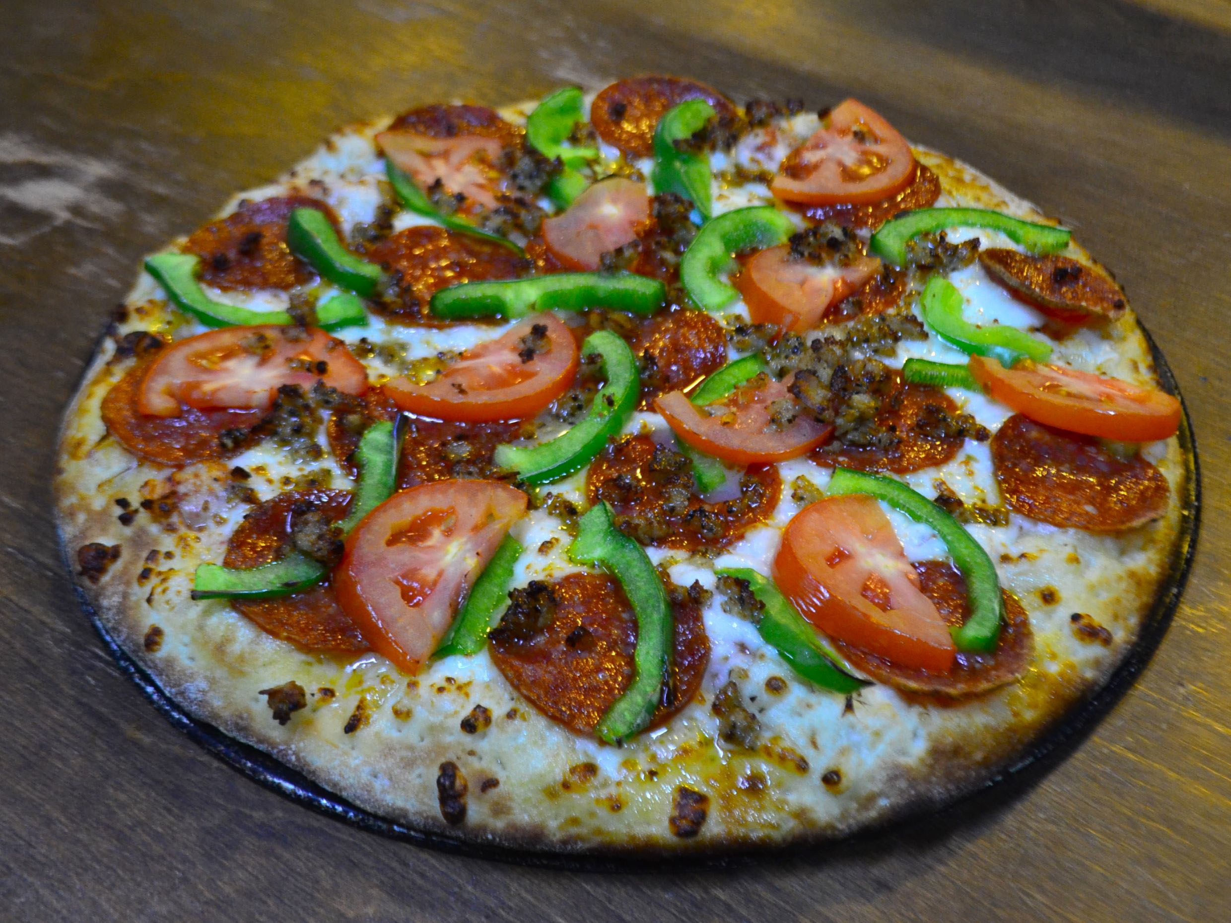 Pepperoni, salchicha italiana, pimiento morrón y tomate.