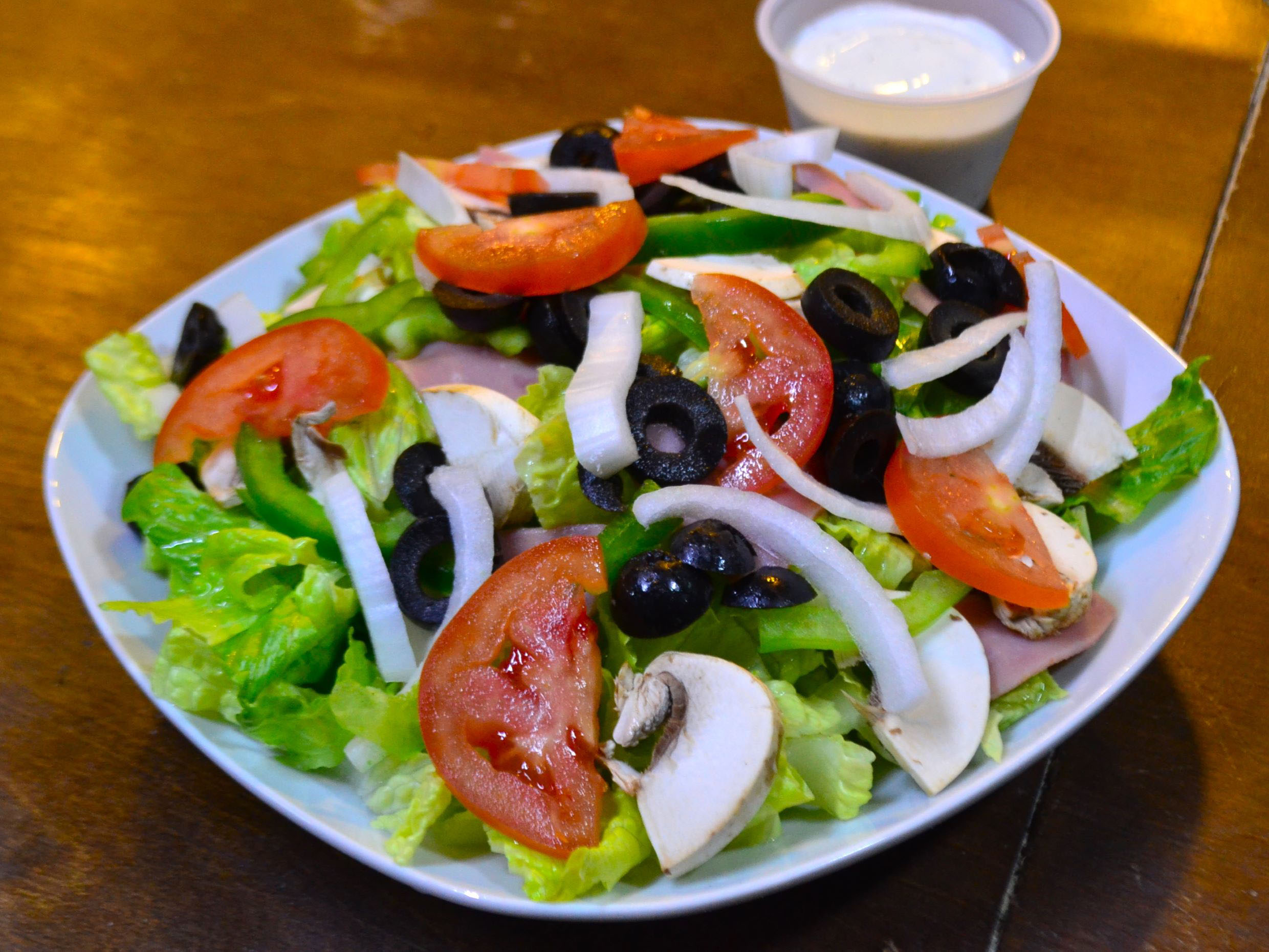 Lechuga, tomate, pimiento morrón, champiñones, aceituna negra, cebolla, jamón y aderezo ranch.