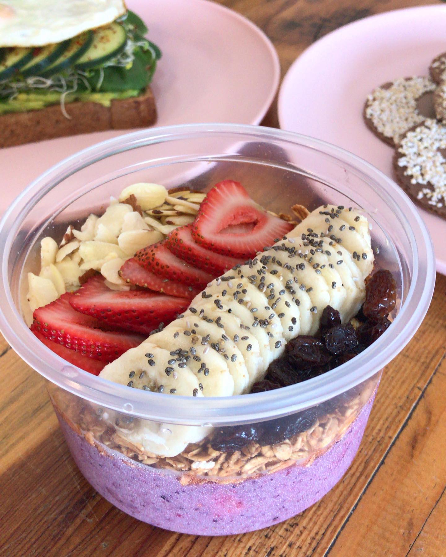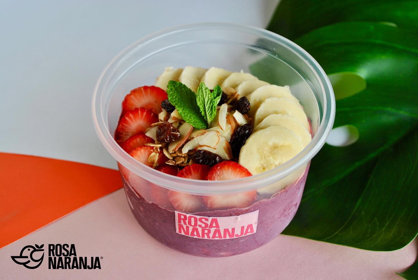 Base de smoothie de açaí: açaí, fresa, plátano y leche de soya + Toppings: granola, fruta, almendras, chía y miel de abeja.