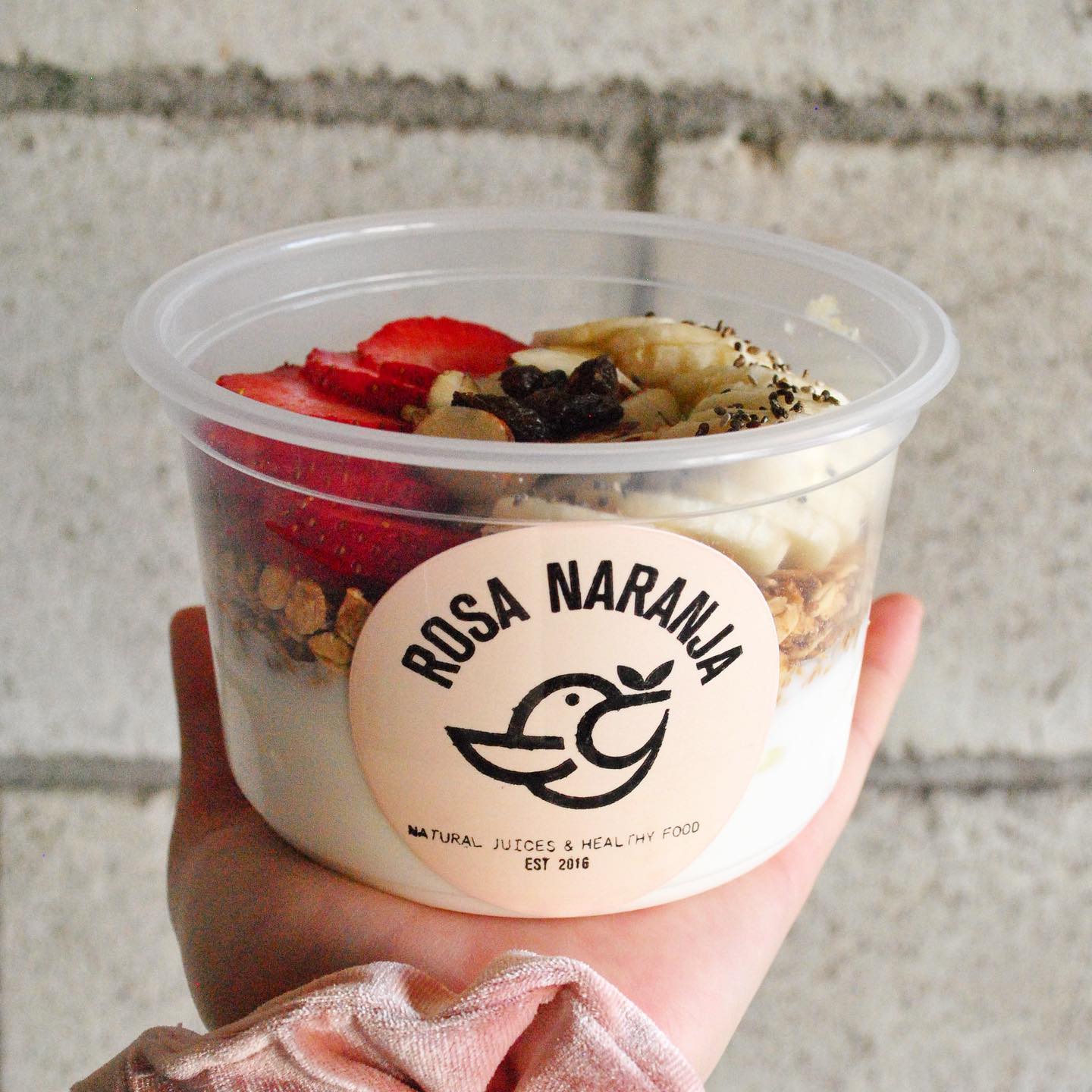 Yogurt natural, granola, fruta, almendras, chía y miel de abeja