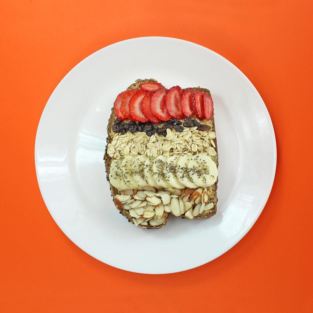 Rebanada de pan tostado integral con peanut butter + Toppings: granola, fruta, almendras, chía y miel de abeja.