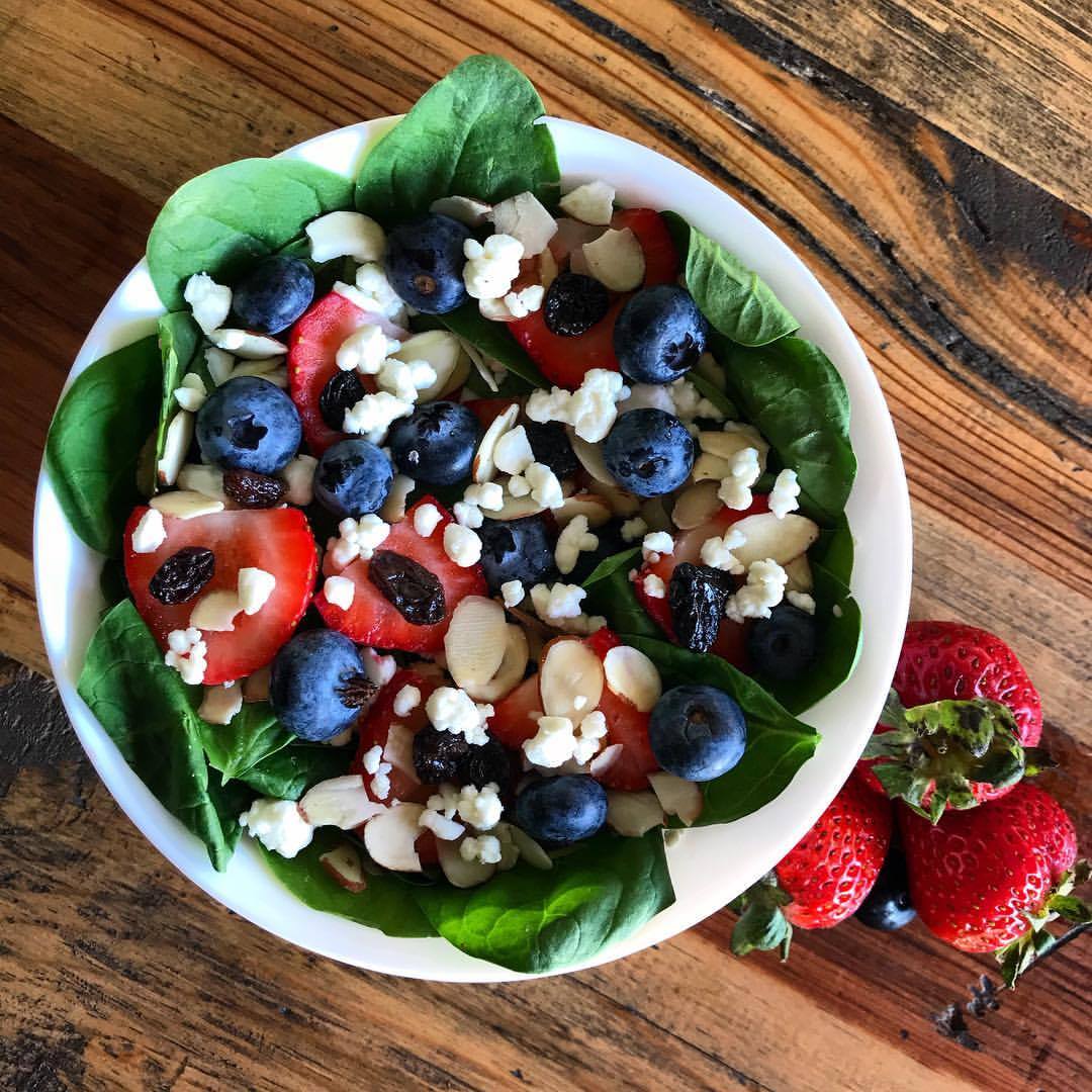 Espinaca, lechuga, fresas, berrys, pechuga de pollo , almendras. una porción de aderezo.