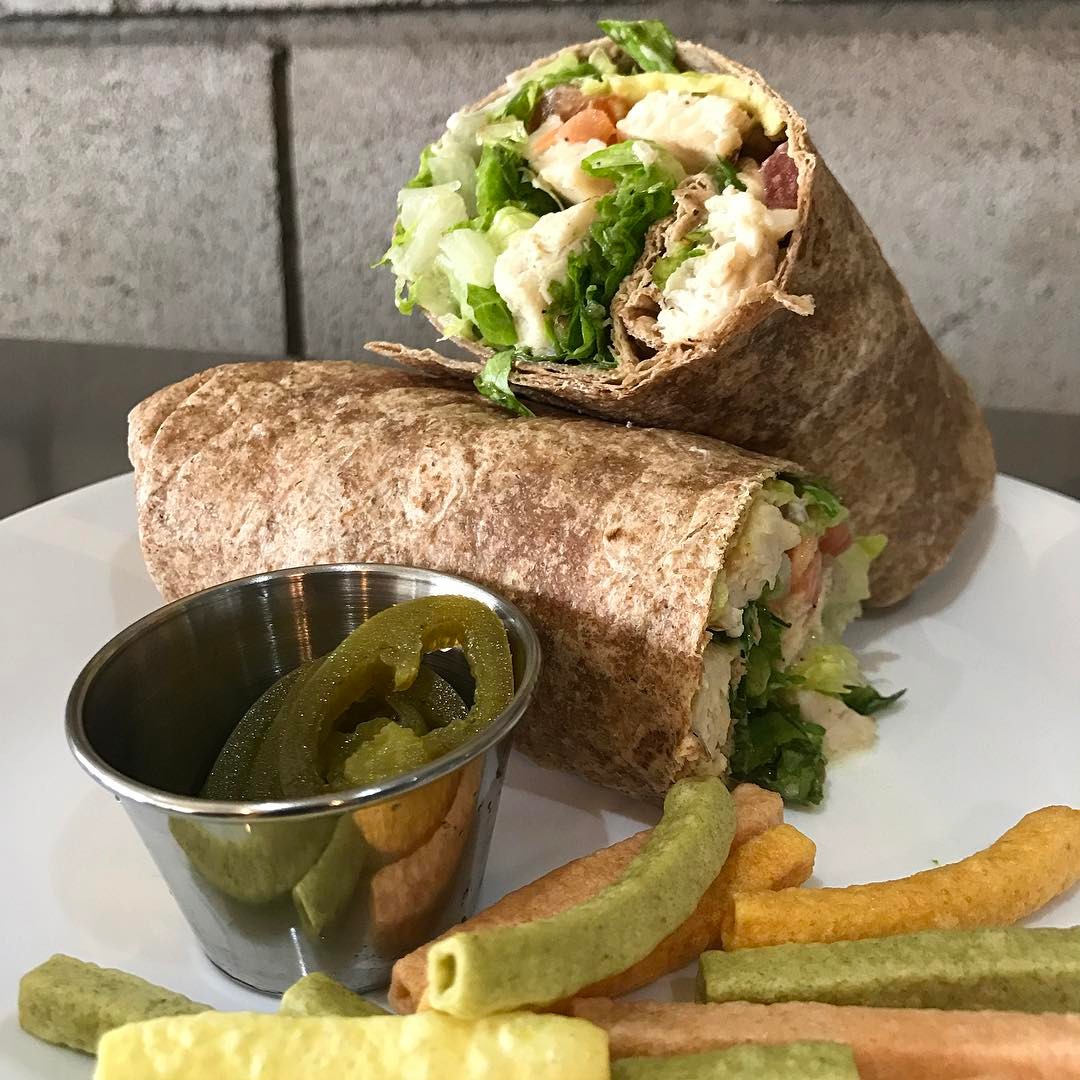 Tortilla de harina integral, pechuga de pollo, lechuga, tomate, cebolla y aguacate. Incluye mayonesa y una porción de jalapeño.