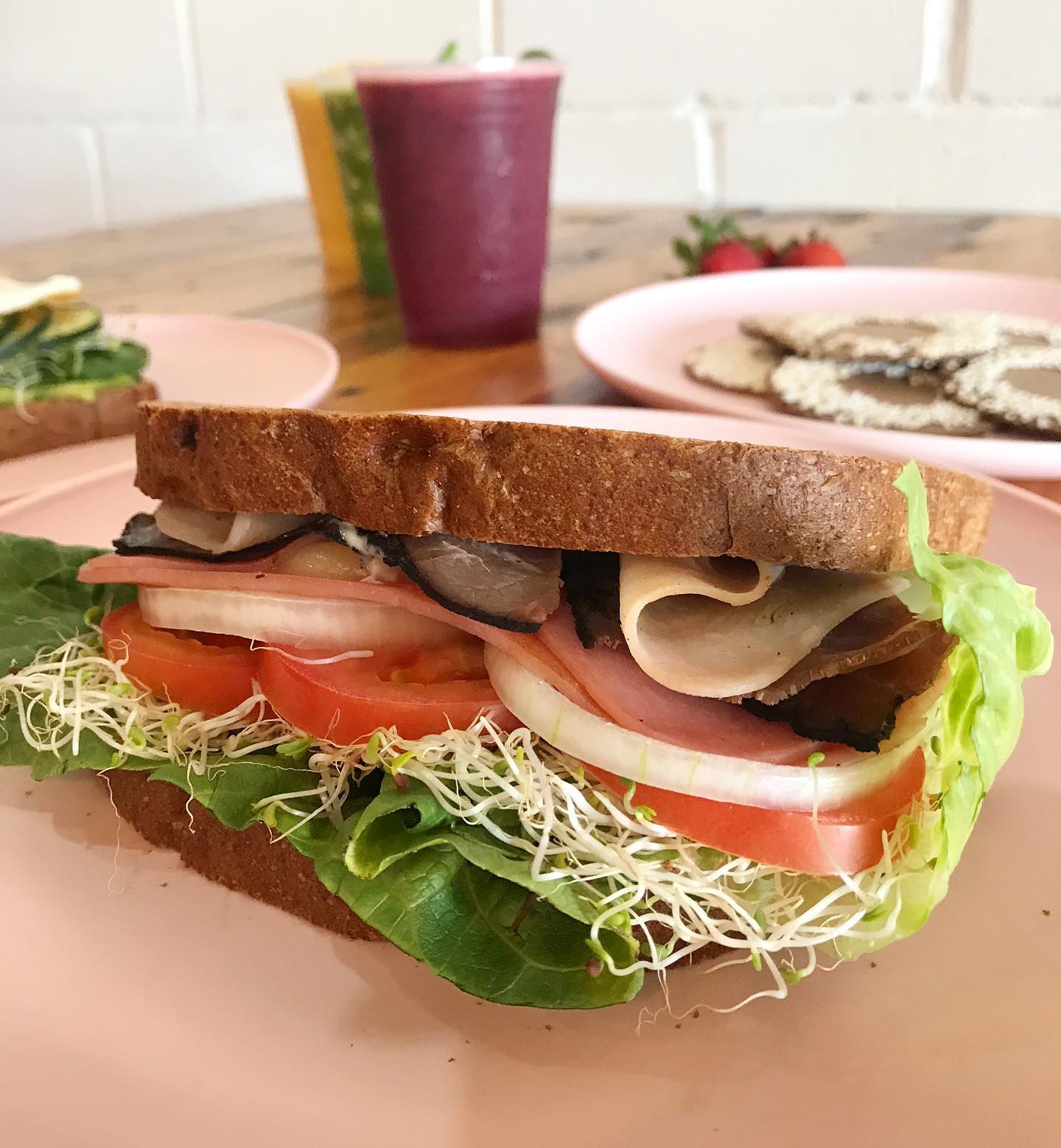 Tortilla de harina integral, rebanada de jamón de pechuga de pavo, jamon de pavo, roastbeef, lechuga. tomate, cebolla y alfalfa, incluye mayonesa y una porción de jalapeño.