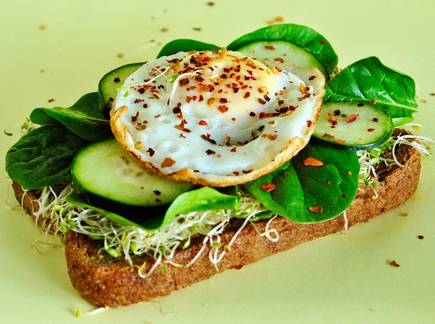 Rebanada de pan tostado integral, aguacate, sal, chile seco, huevo estrellado, espinaca, pepino y alfalfa.