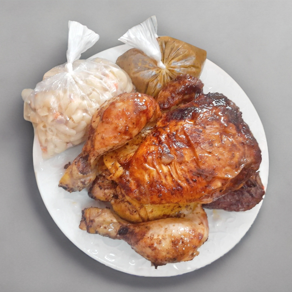 1 POLLO y 1/2, 2 salsas, 2 ensaladas de coditos, 2 ensaladas de repollo, tortillas, una orden de papas, y soda de 2lts