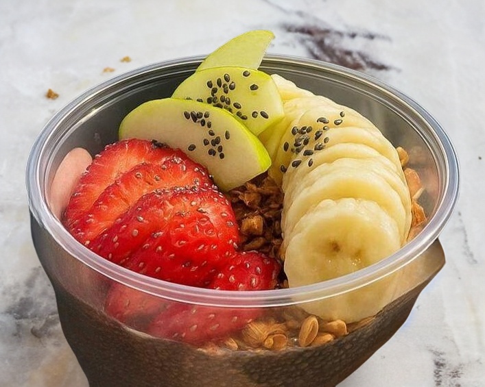 Disfruta de un delicioso bowl de Chia hidratada con leche de tu preferencia, acompañado con fruta fresca de temporada, granola y miel de abeja. Rico en fibra, antioxidantes y omega 3. Perfecto para iniciar el dia y mantenerte satisfecho con un desayuno ligero, rico y super nutritivo.