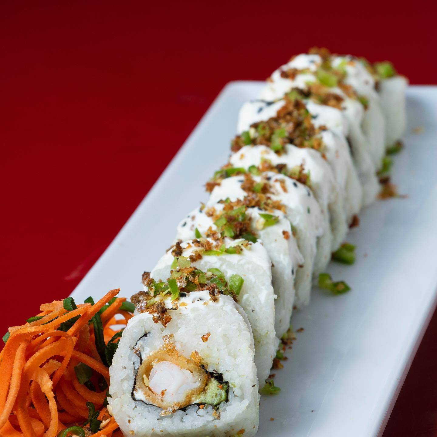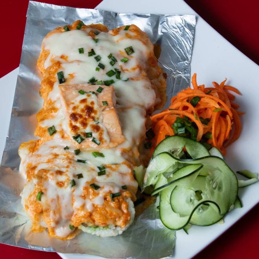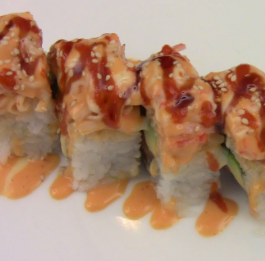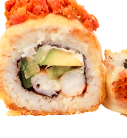 Bola de arroz con Tampico, queso, pollo, res y camarón empanizado. Servido en una cama de Tampico, con aguacate por fuera y bañada en salsa de anguila.