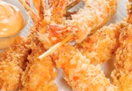 Brocheta de camarón empanizado.