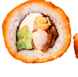 Philadelphia, aguacate y camarón empanizado, forrado en salmón.