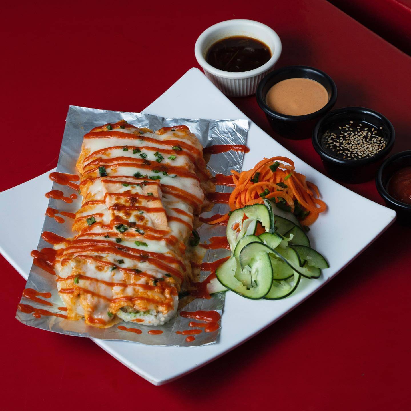 Camarón, queso, aguacate por dentro salsa horneada y salsa sriracha encima.