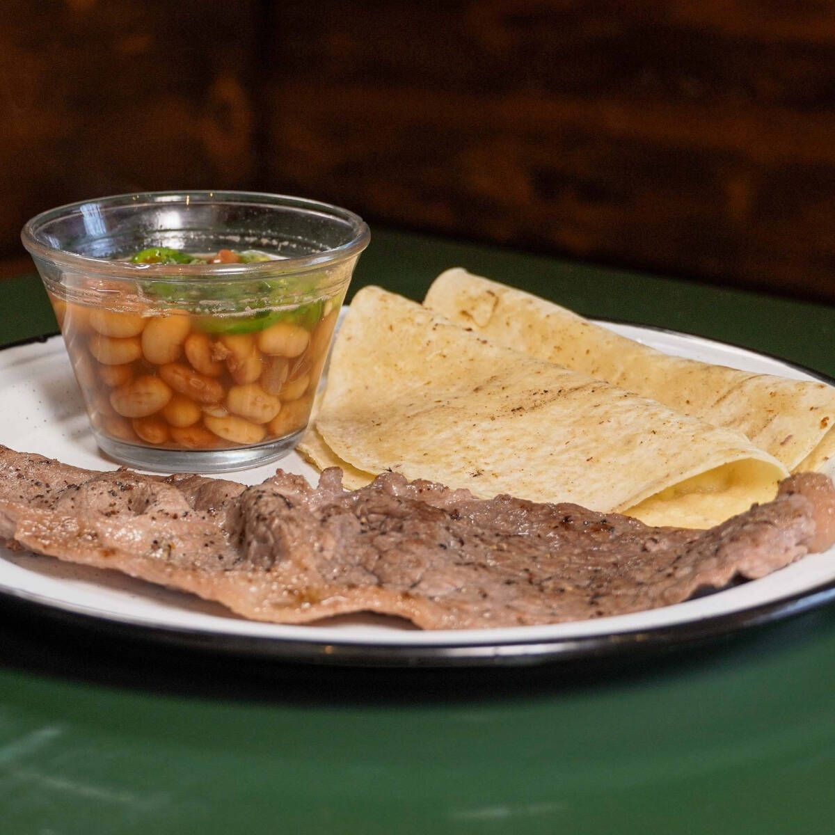 Bistec de res a la plancha con frijoles puercos y 2 quesadillas de maíz.
