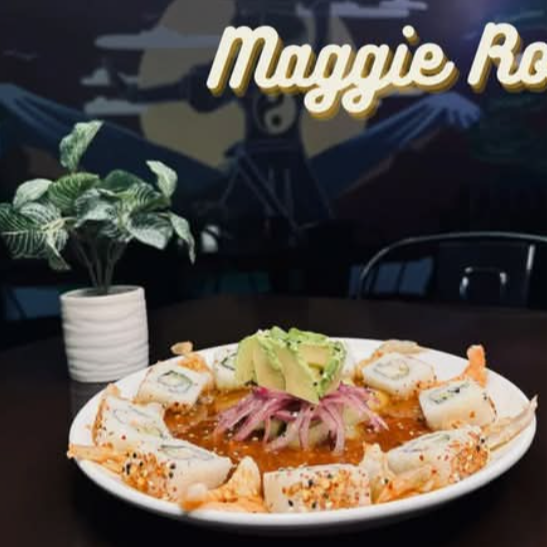 Relleno de queso crema, aguacate, pollo, pepino, camarón, por encima surimi pollo empanizado aderezo ranch, cilantro y chipotle.