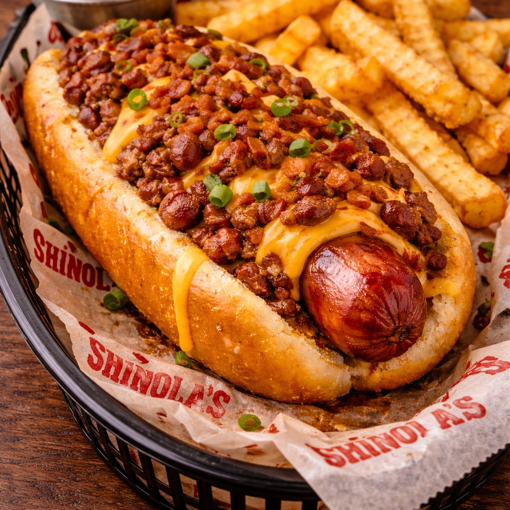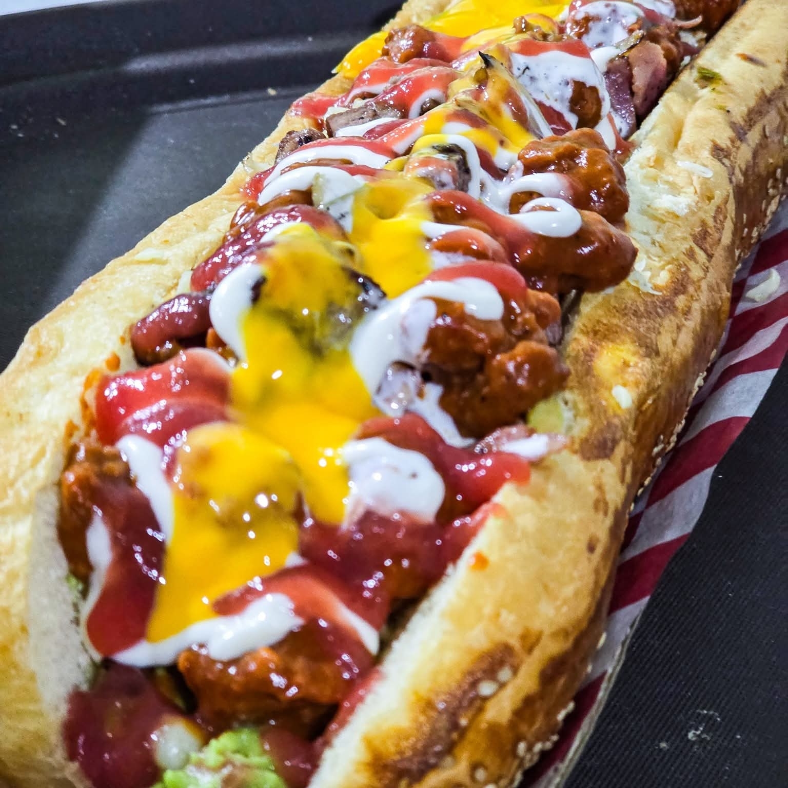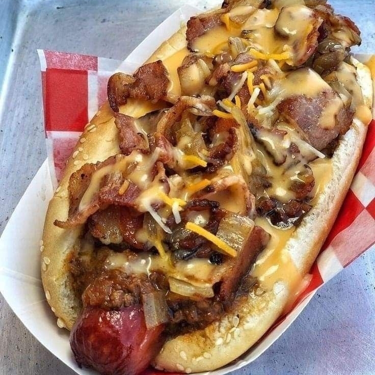 Salchicha de pavo bañada de queso chedar derretido, con queso gratinado que se estira en cada mordida y tocino crujiente.