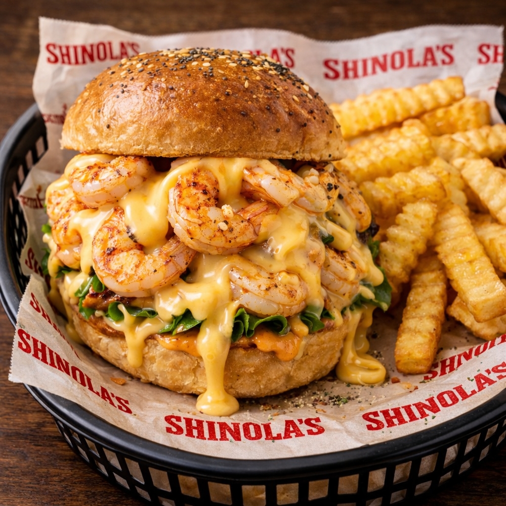 Doble camaron, camarones a la plancha, camarones empanizados crujientes, queso fundido, tocino dorado, cebolla caramelizada, y aderezo cremoso de la casa.