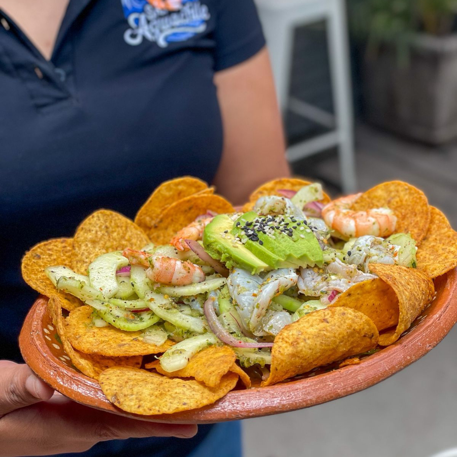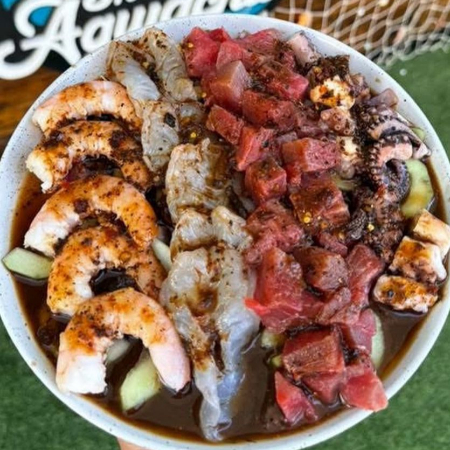 Combinación perfecta de aguachile, pulpo y almeja un mix irresistible, todo curtido en limón con cebolla morada y pepino acompañado de crujientes tostitos.