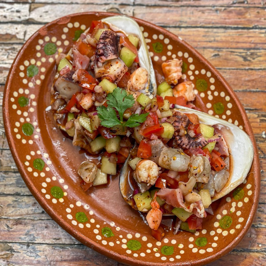 Par de almejas preparadas con pulpo, Camarón cocido, pepino y tomate bañada en nuestra salsa especial.