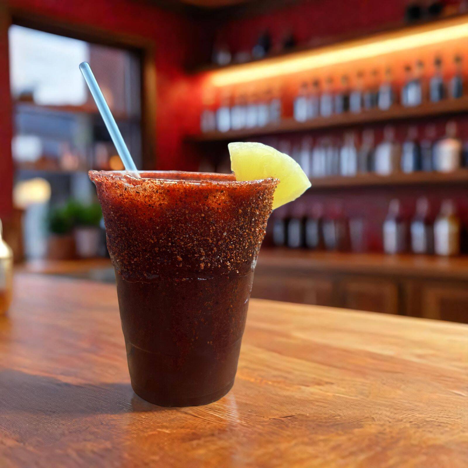 Camarón cocido, pepino, chile verde, tomate, cebolla morada, cilantro con clamato y mezcla de salsas tradicionales de la casa. Servido en vaso de 16 oz