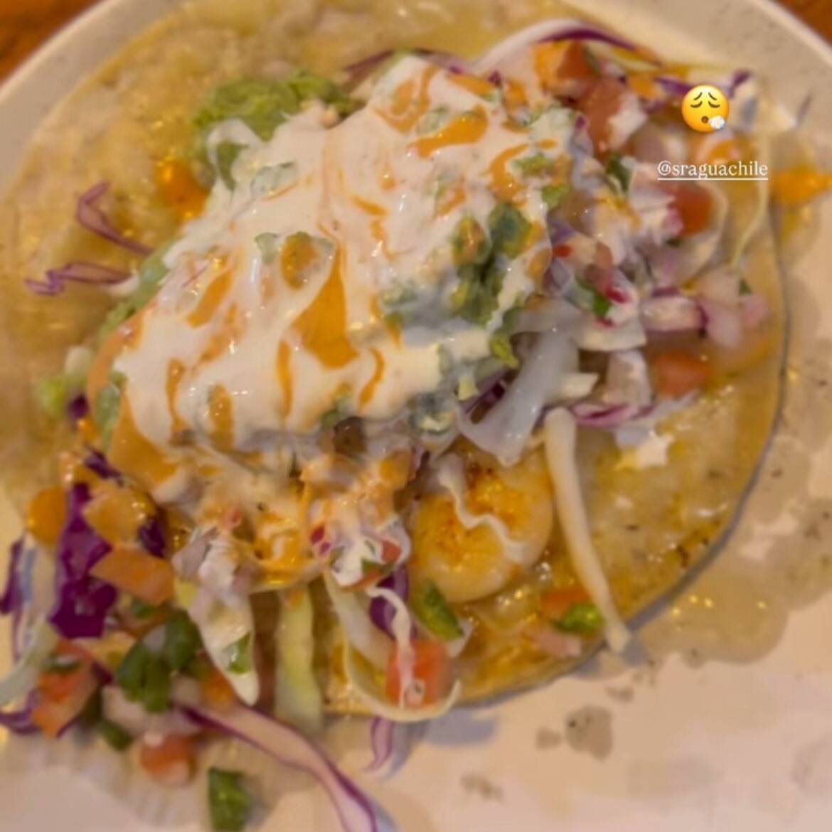 Deliciosa combinación de marlín ahumado y camarón enchilado, salteados con cebolla, servidos sobre una tortilla con queso gratinado. (Repollo, pico de gallo, crema y chipotle)
