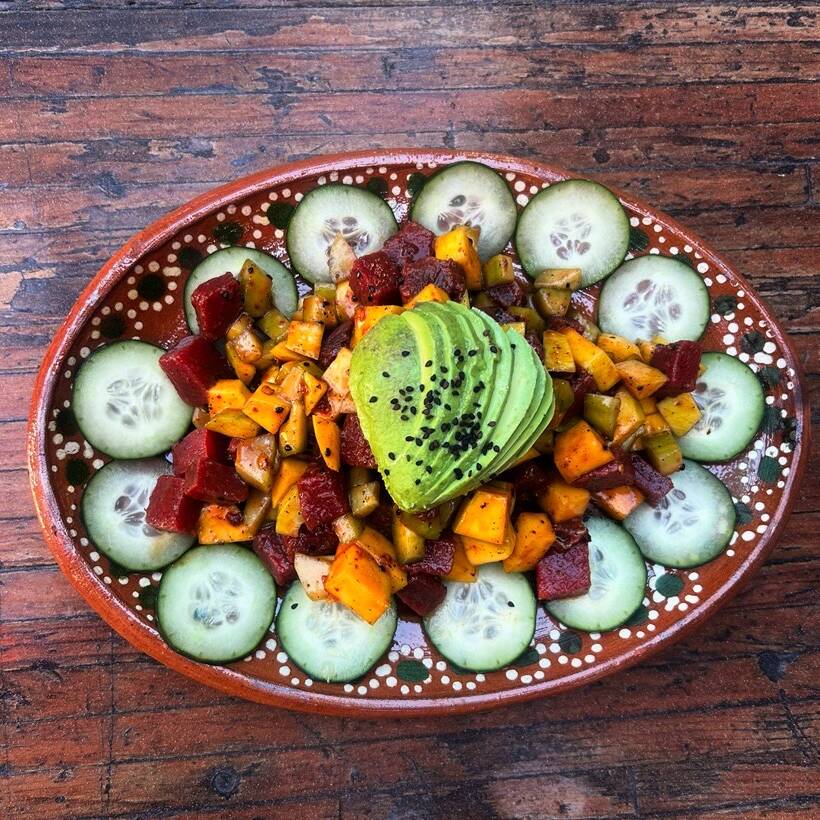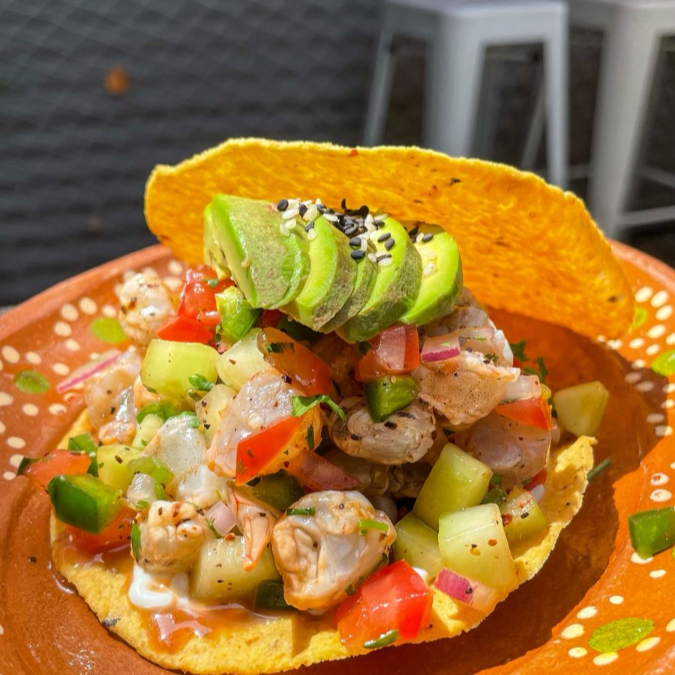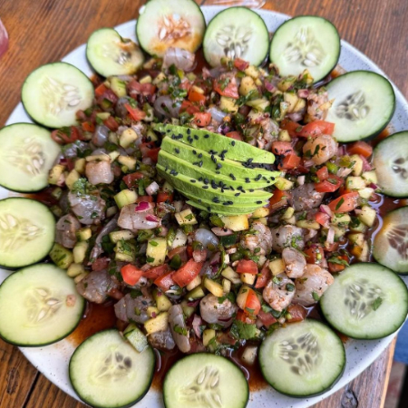 Camarón curtido en limón y salsa de la casa acompañado de pepino, tomate, cebolla morada y cilantro, decorado con aguacate