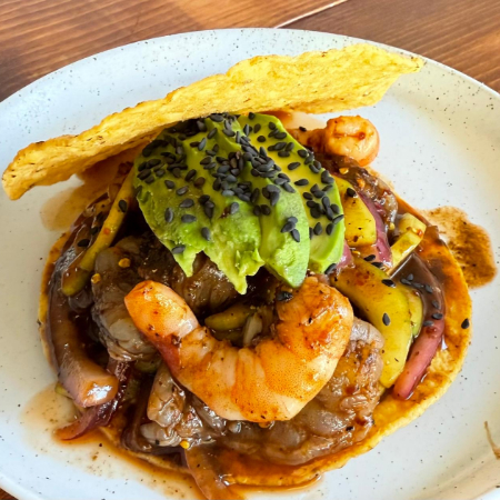 Delicados trozos de pulpo perfectamente sazonados, combinados con crujiente pepino y cebolla morada, todo bañado en nuestra exclusiva salsa de la casa. Una tostada fresca y deliciosa.