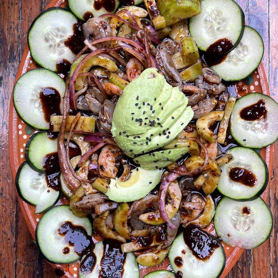 Deliciosa entrada, camarones curtidos, camarones crudos, atún y mango sobre una cama de pepino y cebolla bañada en la famosa salsa de la casa