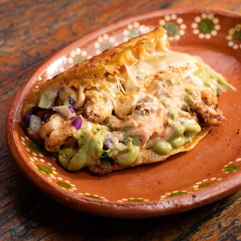 Queso taco con camarón salteado en mantequilla, pimientos y cebolla con costra de queso, doradito como se debe.